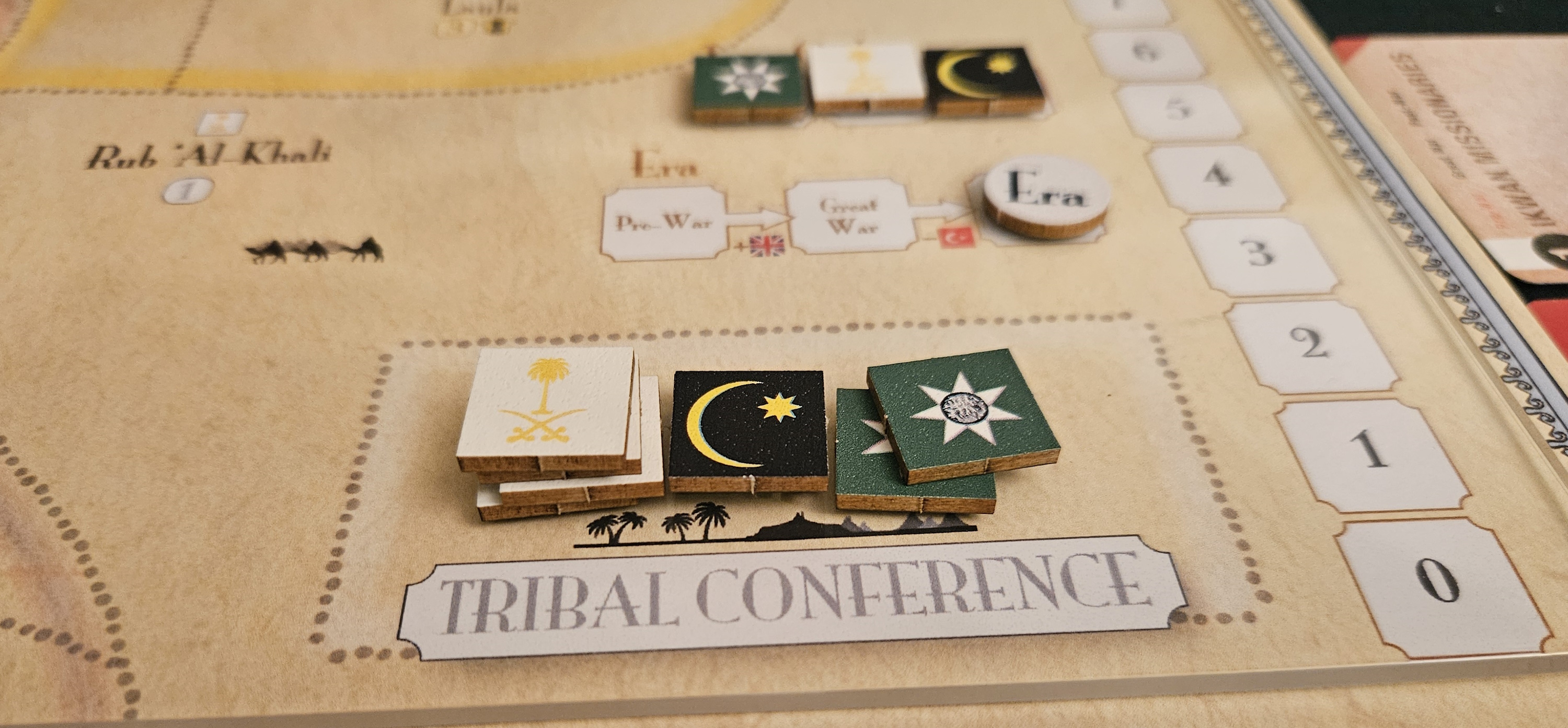 Let’s talk victory. Points in Arabian Struggle come from three sources, with each avenue demanding its own considerations. First is battle. Winning an attack might award a point. Might. In order to win a “great” victory, and therefore earn a victory point, you need to fully rout your opposition. That means emptying the space you invaded of opposing pieces. This naturally lends itself to easy victories, swooping two or three chits into a territory with only a single enemy chit, lest your rival survive their casualty roll and force your troops to retreat. In turn, this encourages a different sort of thinking about warfare. Big clashes produce big swings, and are often essential for seizing major territory, but they’re also dangerous. Minor battles prove your tribe’s prowess and earn points. It’s a fitting contrast for a conflict where the Saudi conquest of Riyadh consisted of fewer than a hundred fighters per side.