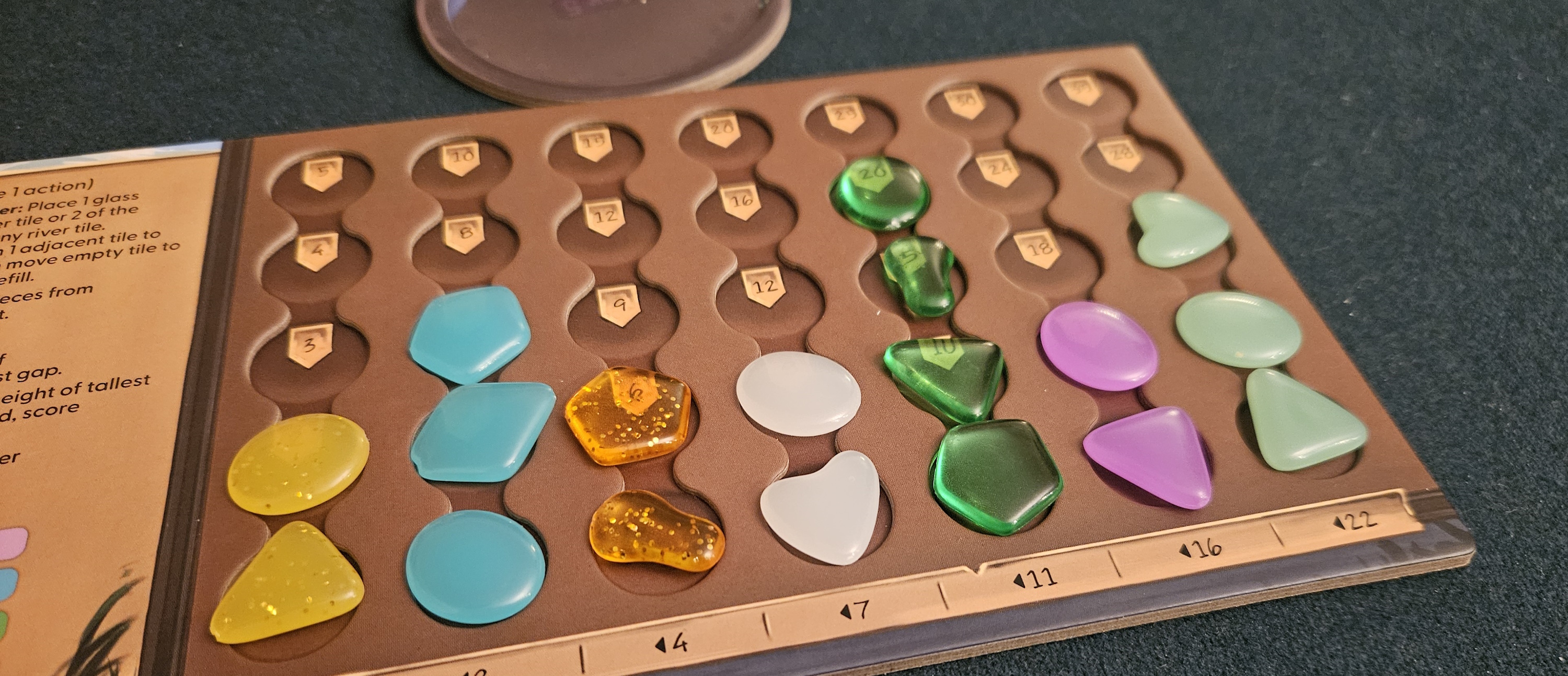 The worst offender bursts into the game in its final moments. As soon as somebody accumulates seventeen pieces of glass, the endgame is triggered. The current round wraps up, everybody gets one more turn after that, and then it’s gently wafting curtains. But the instant that trigger is pulled, everybody whose pan has fewer than four or five pieces of glass gets to draw back up to three pieces from the bag. This bypasses anything resembling planning. Much of the game moves to a particular rhythm, one of keeping your pan full enough to make good selections at the river without refilling so often that you waste time or send too much glass to your overflow. That’s thrown into disarray by a late-game draw. Even more rotten, one player’s newly drawn glass might be perfect for their intended selections while everybody else’s are subpar. Given the tightness of the game’s final scoring, this is often enough to decide the entire session on a single draw.