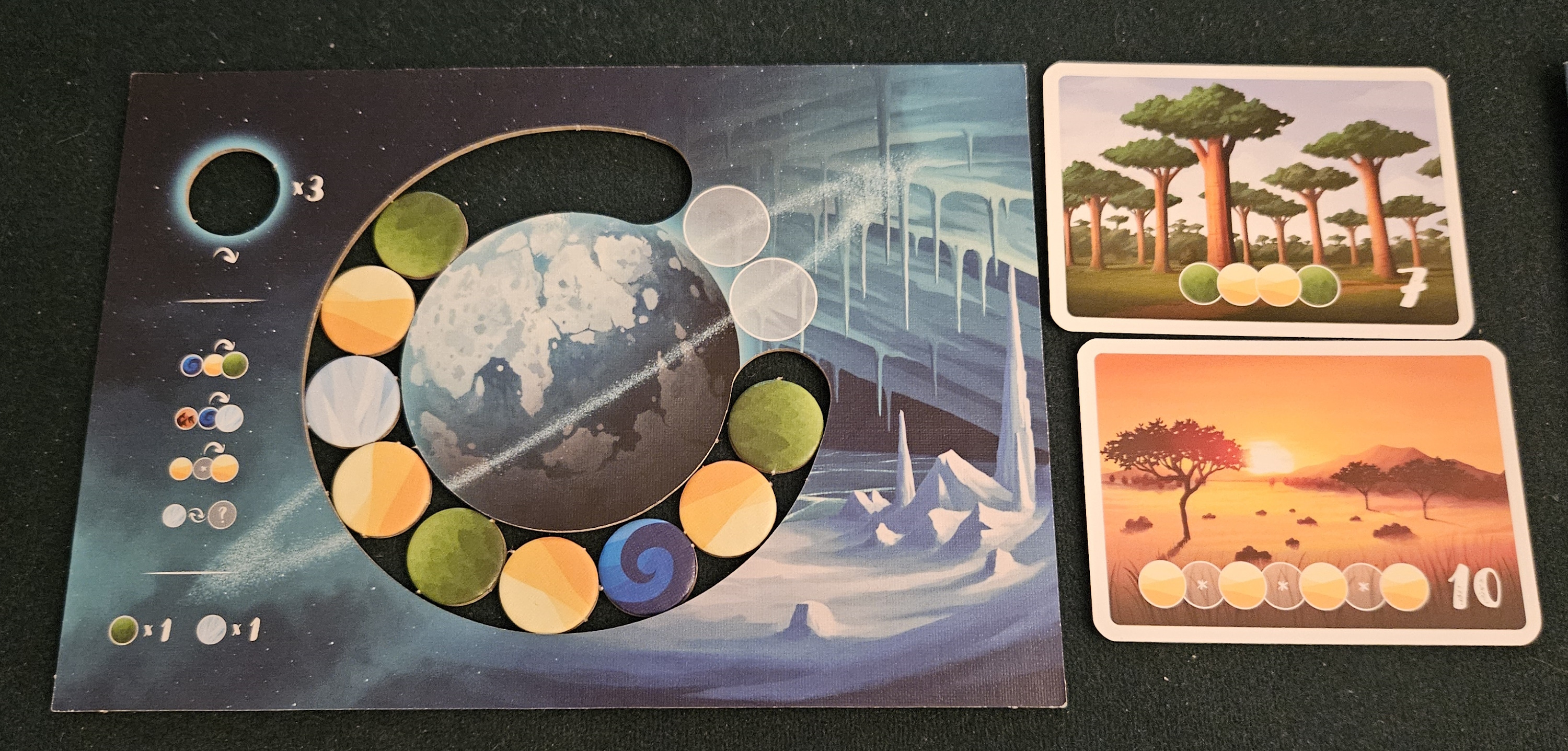 Breezy. Also barely functional. Biomes are nearly always a cinch to complete. Most of the time, a biome is completed by having only two or three terrain tokens in the proper sequence. There are a few tougher cards on display, but these don’t replenish like the easier fare. Biomos soon becomes a game of dribs and drabs. Have two deserts next to each other? Points. Seas and glaciers? Points. Make a minor adjustment to a nearby stretch of terrain? Points. Do nothing at all? Sometimes that also awards points.
