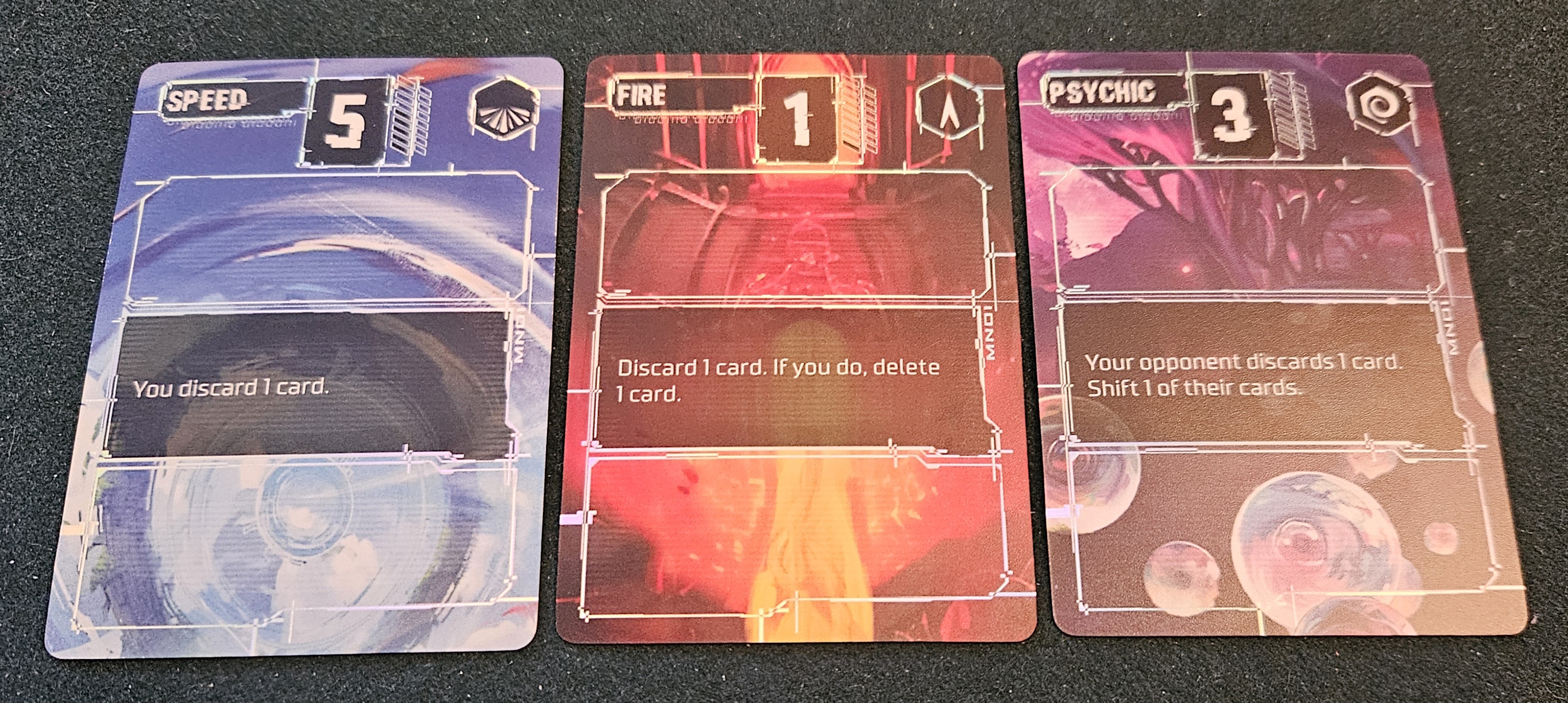 The same goes for some of the card effects. The rules sheet explains that only uncovered cards can be shifted or flipped. Okay, another callback to Air, Land, & Sea. Easy. But then certain effects specify whether they affect you or your opponent, while others decline to identify their target. “Discard a card.” Okay, but who discards it? I’m asking because other cards tell me “You discard a card” or “Your opponent discards a card,” but this one just throws the command out into the atmosphere and expects me to obey. For a genre and a setting that demands mechanical precision, there are too many flubs here. It doesn’t wholly ruin the experience, but it does make it significantly harder to onboard than it should have been.