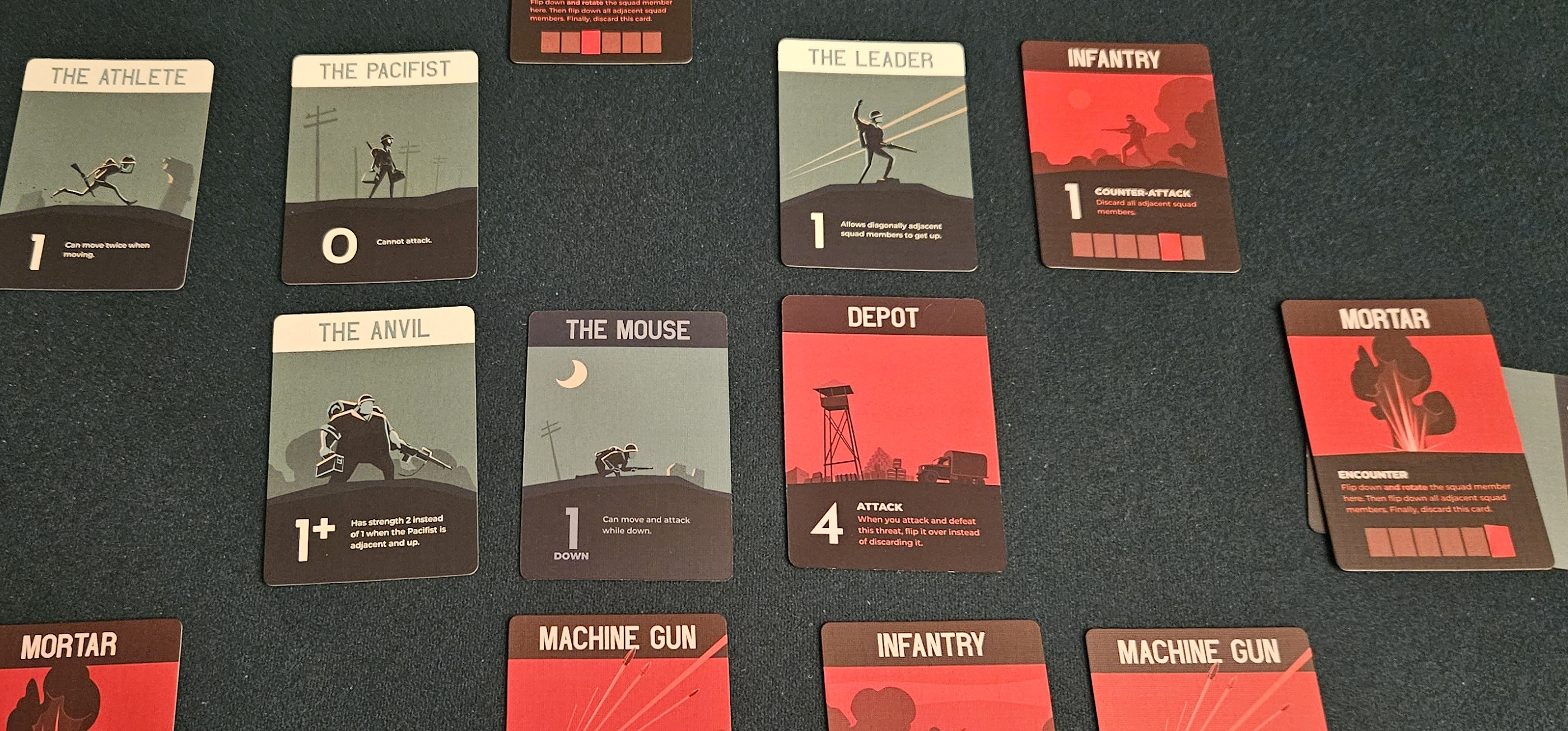 Your squad of eight soldiers has been ambushed. One of your men, the unlucky eighth, was vaporized in the opening volley. Now that everybody’s hit the deck, it’s time to scramble around the table, pick up the stragglers, and stem a bum-rush of enemy threats. Mortars and machine guns suppress your boys, tanks and flares lock down lanes and spaces, and infantry stalk up close to eliminate anybody hapless enough to stay pinned down for more than a few seconds. It’s a bona fide firefight.