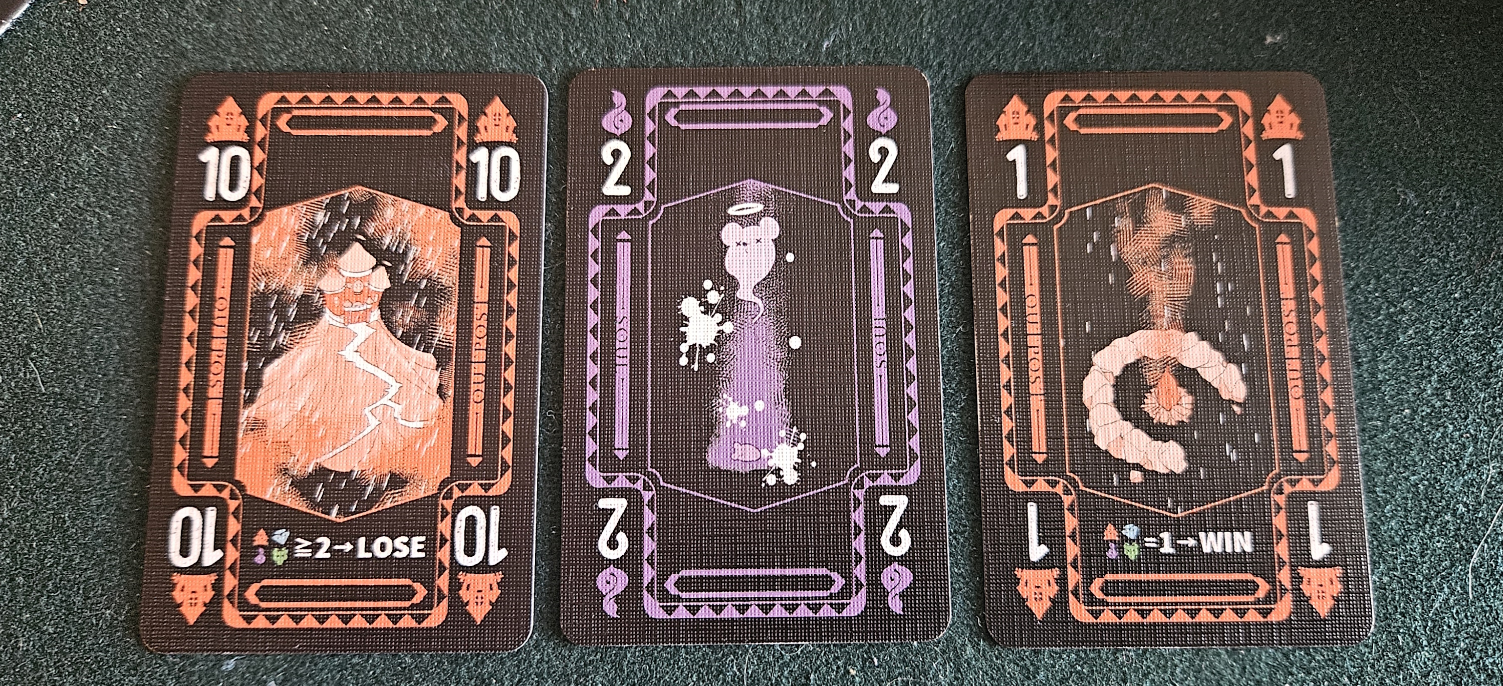 Is this a problem? It’s hard to say. The effect is less pronounced with three players than four, solely because everybody is handling more cards per round. At the very least the game is swingy, but also brisk enough that a truly spoiled tally feels like a mercy killing rather than torture. And that swinginess is very much the point, with just enough wiggle room to permit players to gang up on somebody who hasn’t had their score poisoned enough. The devil’s workshop indeed.