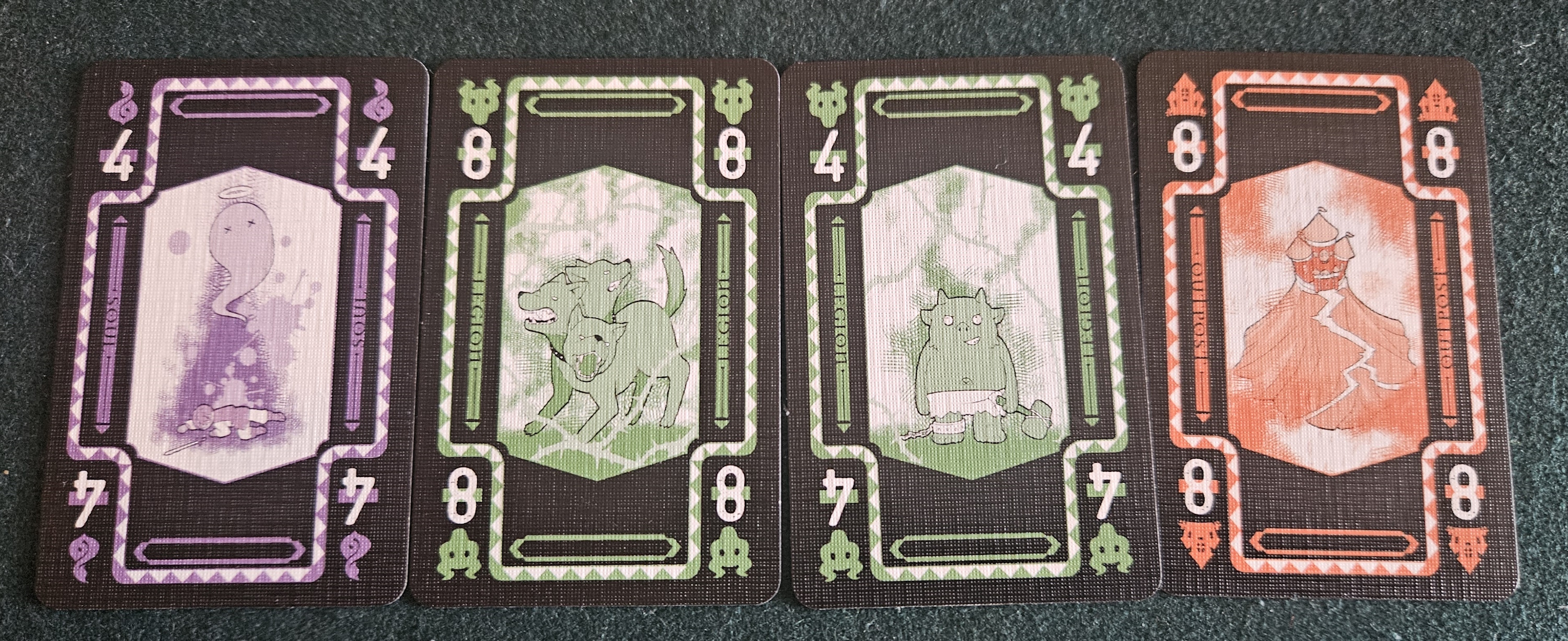 As a trick-taker, Idle Hands is all about poisoning the well. Spoiling a trick is a well-known strategy among enthusiasts, but here the concept is given its fullest expression. The idea is that every card you win is worth a positive point. Except for 4s and 8s, that is. Those are worth negative points. Negative points worth their rank. While every other card is worth a measly +1, these are worth -4 and -8 respectively.