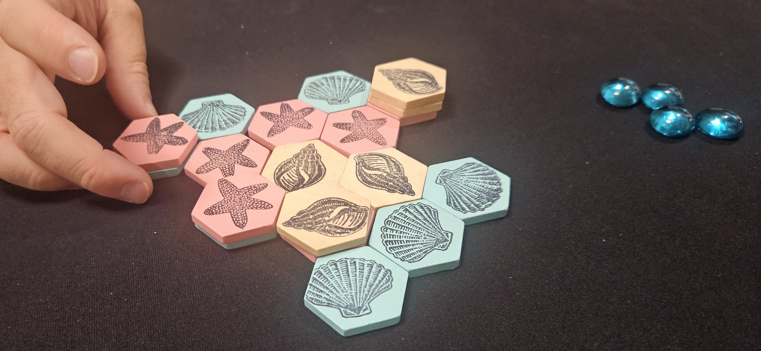 As soon as somebody can no longer move, the pool is frozen in time. You win the session by having the most creatures showing. If that tally is tied — it often is — then the highest shell wins. If another tie results, then whomever made the last move wins. The tiles throw up a pleasant clatter as you mix them together again. Best to three or five is the usual threshold for victory.
