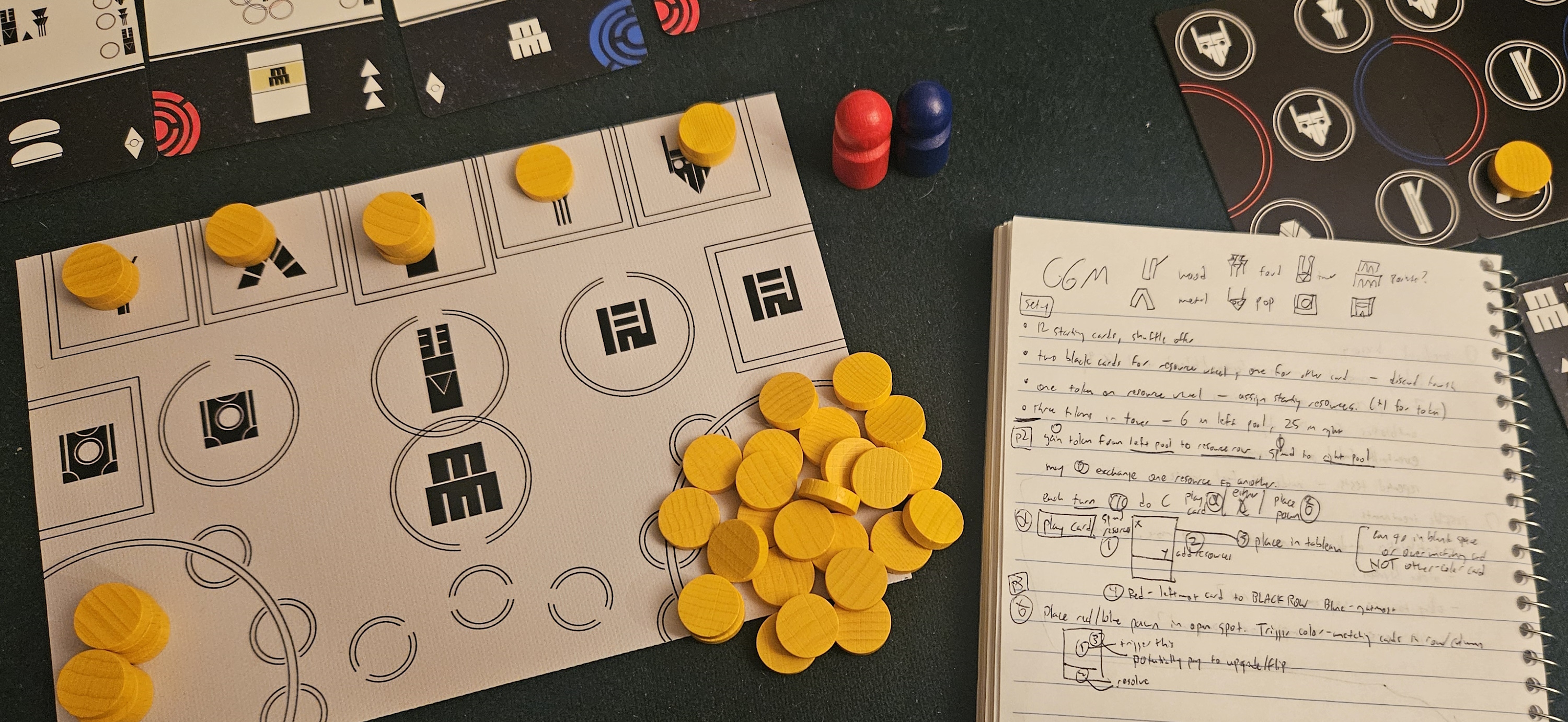 In this mode, Holland threatens to overwhelm players. Unlike LOK or other puzzle games that ask players to teach themselves the rules one trickle at a time, City of Six Moons hits players with a blast from a fire hose. The rulebook isn’t large, only seven pages plus Holland’s in-universe production notes. Without any explicit meanings, however, it can loom as large as an ocean. Like facing down a research project, the task lies in figuring out how to swallow the elephant without unhinging one’s jaw. I began with the most digestible morsels: digits, verbs, nouns. Placeholder titles served well enough for the time being. One resource looked like a tree, so I termed it wood. Another looked like a rudimentary dwelling; this one I titled stone. An alien face became population. Swaying stalks, food. The two more abstract resources, which resembled nothing so much as companion cubes from Portal, I labeled Super and Duper.