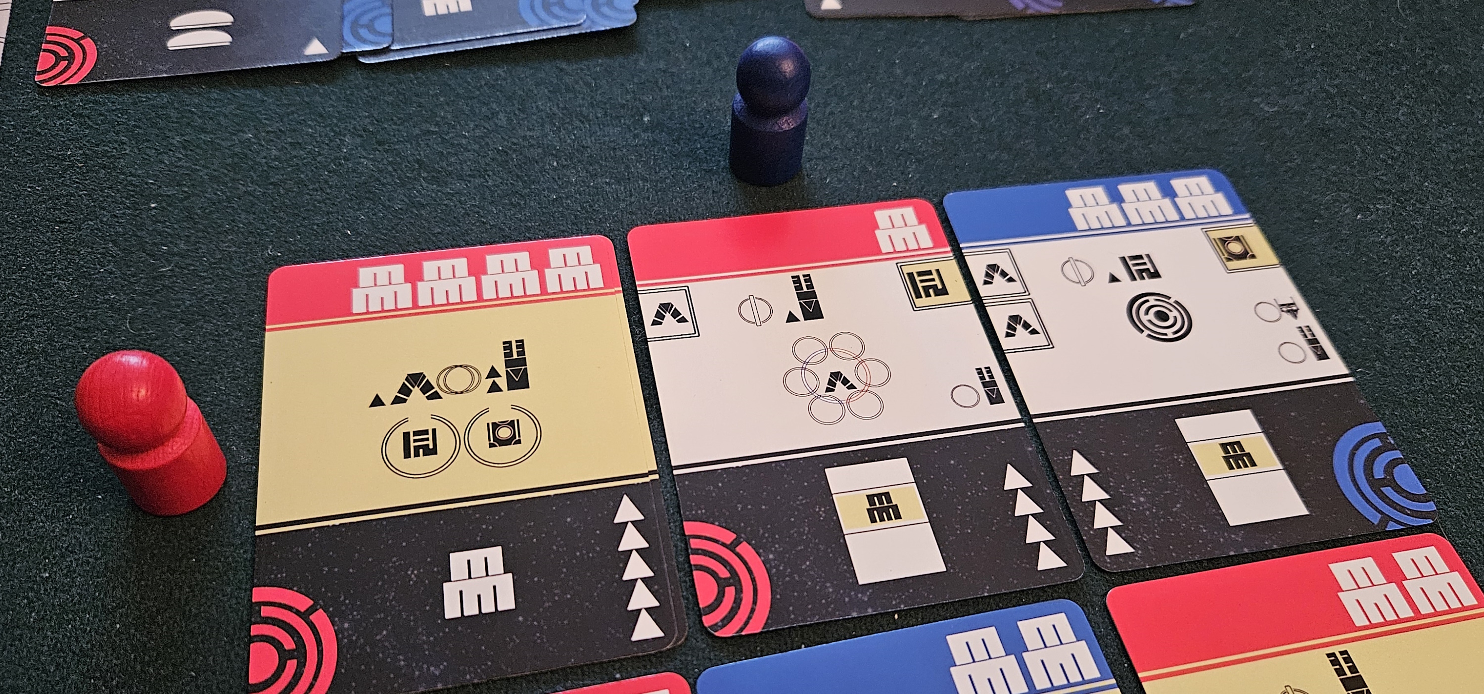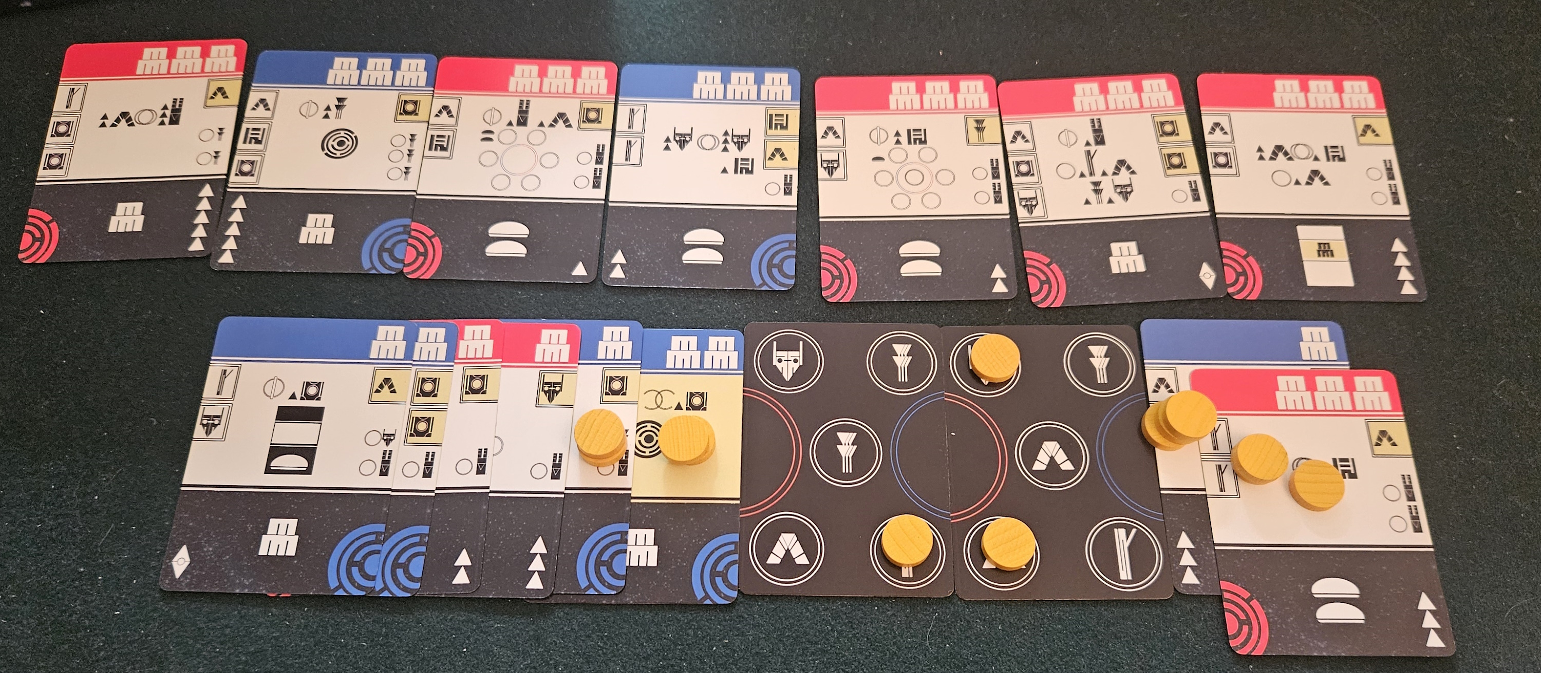 In my telling, City of Six Moons was a contest between city-states. This is the second category of its translation, that of the story’s attachment to something recognizable, both via storytelling and play. Truly there is no other way to translate a board game than to play it, to arrange its pieces and navigate their interaction, to see which movements feel natural and which gash like a wound across its tissue. This is like learning a dance, feeling the rhythm of things. Again, a supposition on my part: that there should be a rhythm, and if a rhythm then one that taps to a familiar meter. Counters move from one stockpile to another; are gained from left to right; are spent to the underworld. Cards are earned and slotted, or else disrupted by a vague third-party intelligence that sets the game’s tempo. There is a tableau — really three of them — which is triggered by pawns and periodically refreshed.