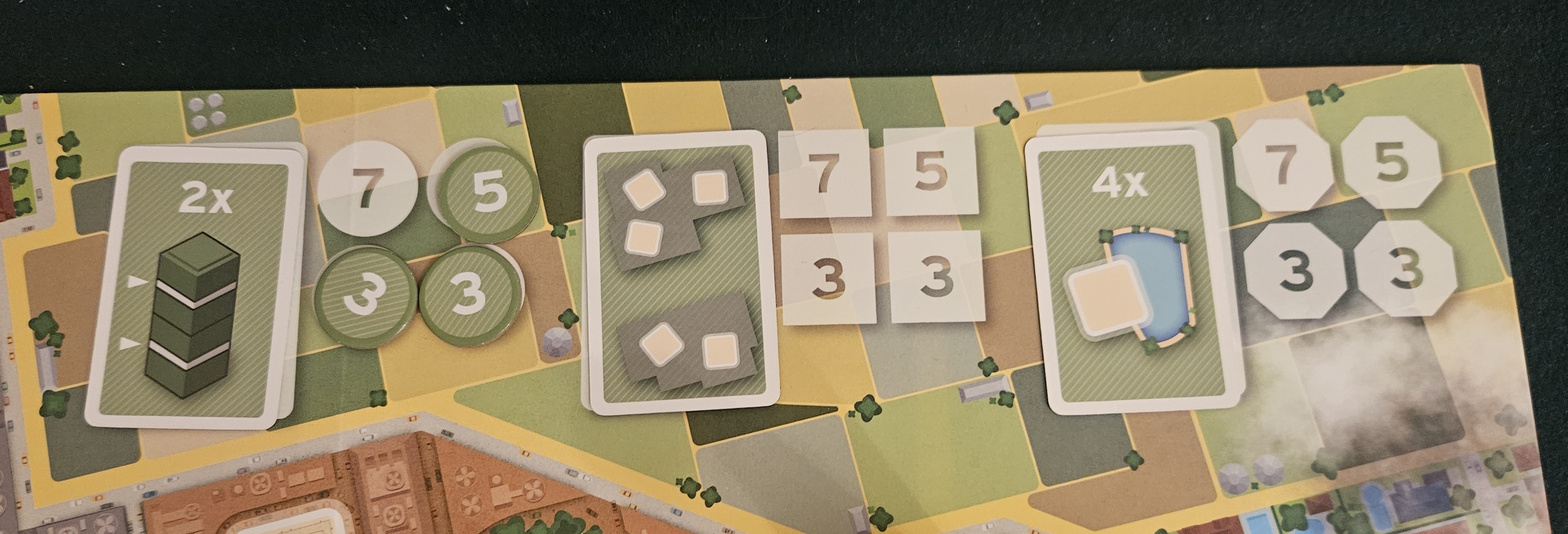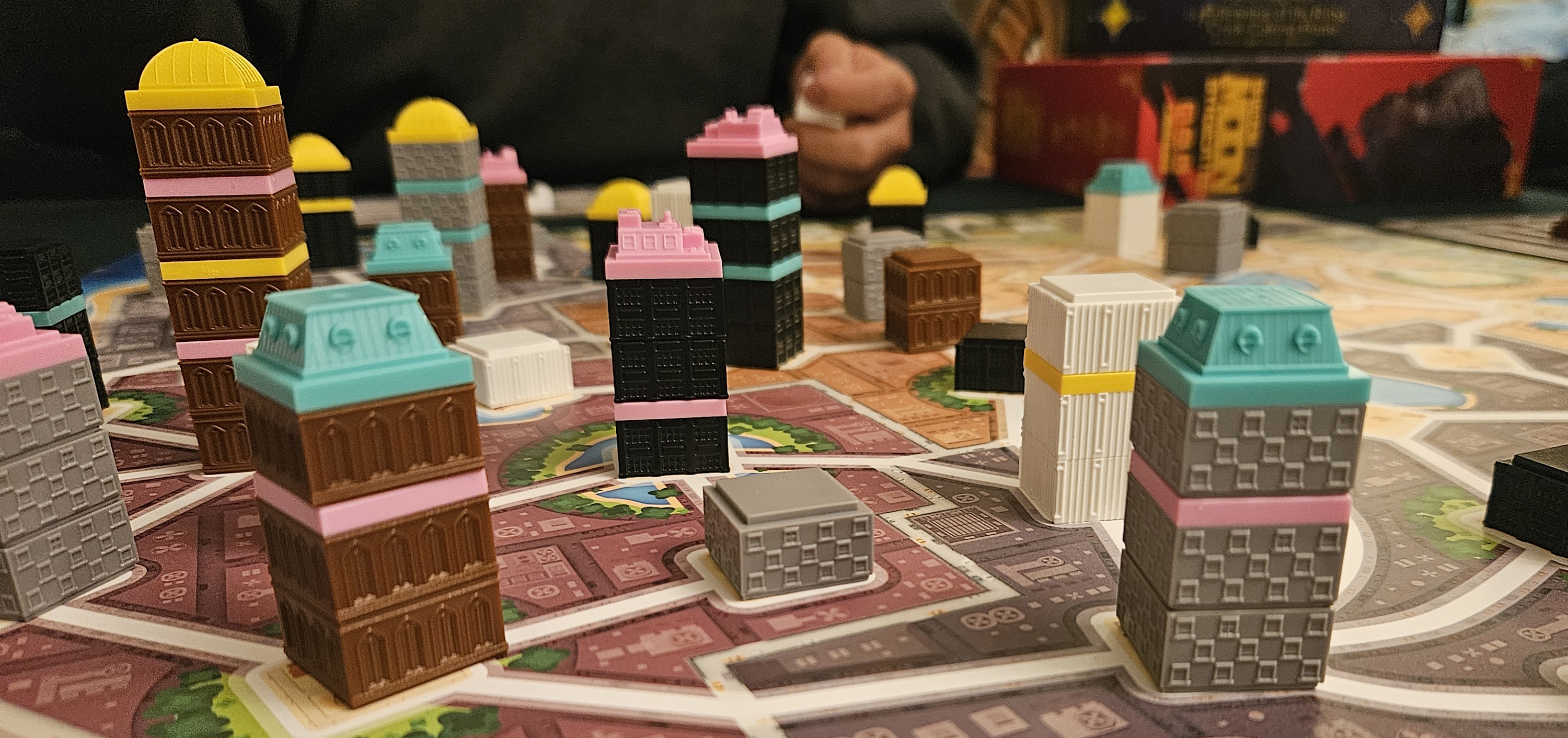Of course, it’s a rare session that doesn’t feature some sort of blocking. Rooftops indicate your ownership stake in a building, but they can be covered up by additional floors, and therefore be capped by other players’ roofs. This doesn’t deprive you of your stake in that building — indeed, it’s sometimes the case that an objective will explicitly require you to have a covered-up roof. Still, for scoring purposes it’s better to be on top. AND IN THE GAME. Pardon me. My editor informed me that I was contractually obligated to include that line.