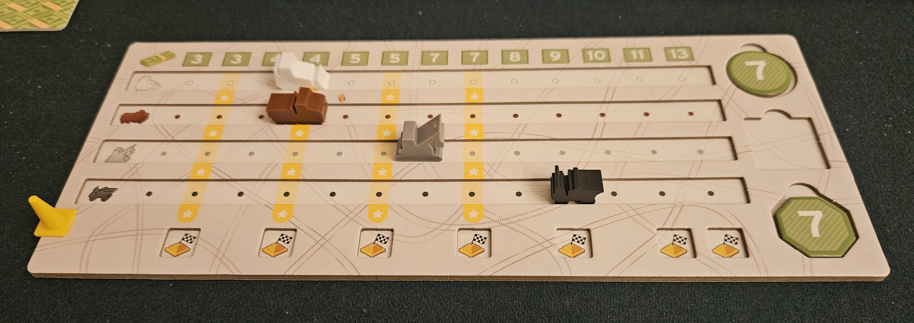 Another example arises from the placement of those actual rooftops. Whenever you place a roof, you score points by moving along the corresponding color of track. Placing a rooftop on your brand new level-one brownstone would only be worth one brown point, while piling it onto the neighboring six-story granite skyscraper would be worth six white points.