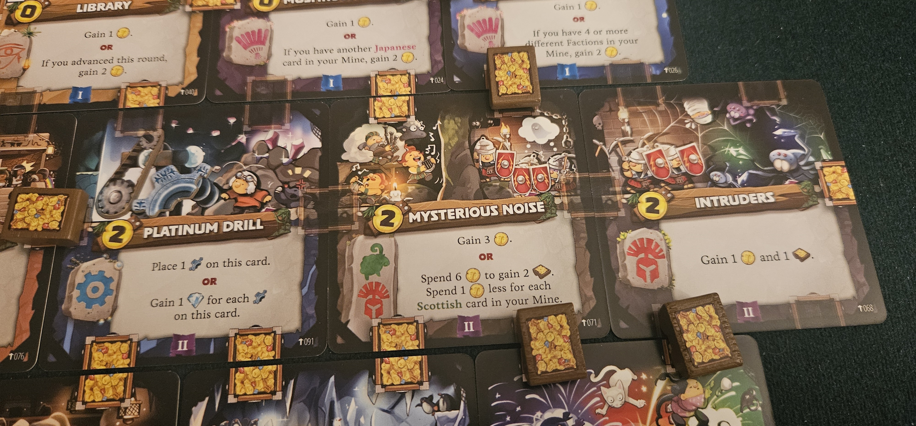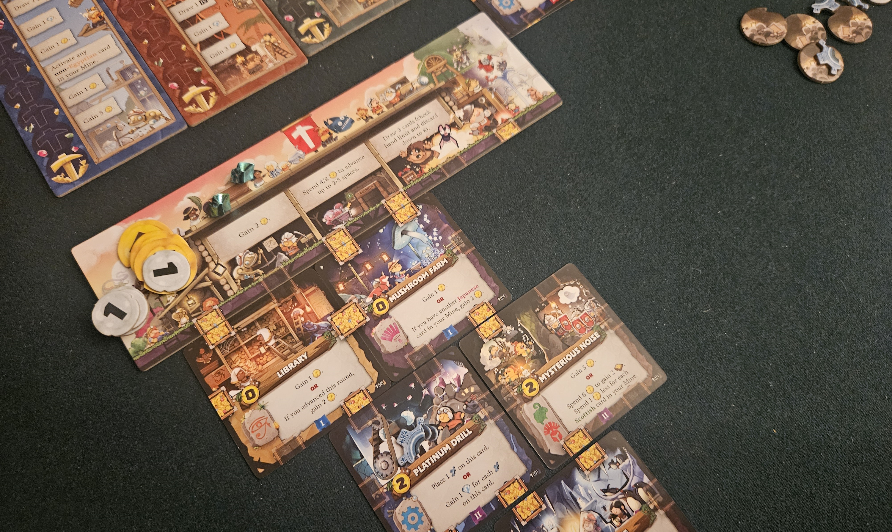 It helps that Imperial Miners is populated by a cast of weirdo kids, each of whom bring their own abilities to the table. As in previous Imperial outings, this is a strange bunch, a near-even mix of historical and fantasy nations. The Scottish, according to some stereotype I never got the memo on, are tremendously expensive, but also come paired with ways to reduce their costs, while the Egyptians move players up the game’s bonus tracks, the Japanese lean into their natural diversity (!?), and the Romans… actually, I forgot what the Romans do, which maybe outs them as the gang’s most whitebread kiddo. On the more fantastical side, the Atlanteans add little gears to their cards to boost productivity while the Barbarians collapse entire sections of their mine for temporary boosts that might need to be excavated again later.