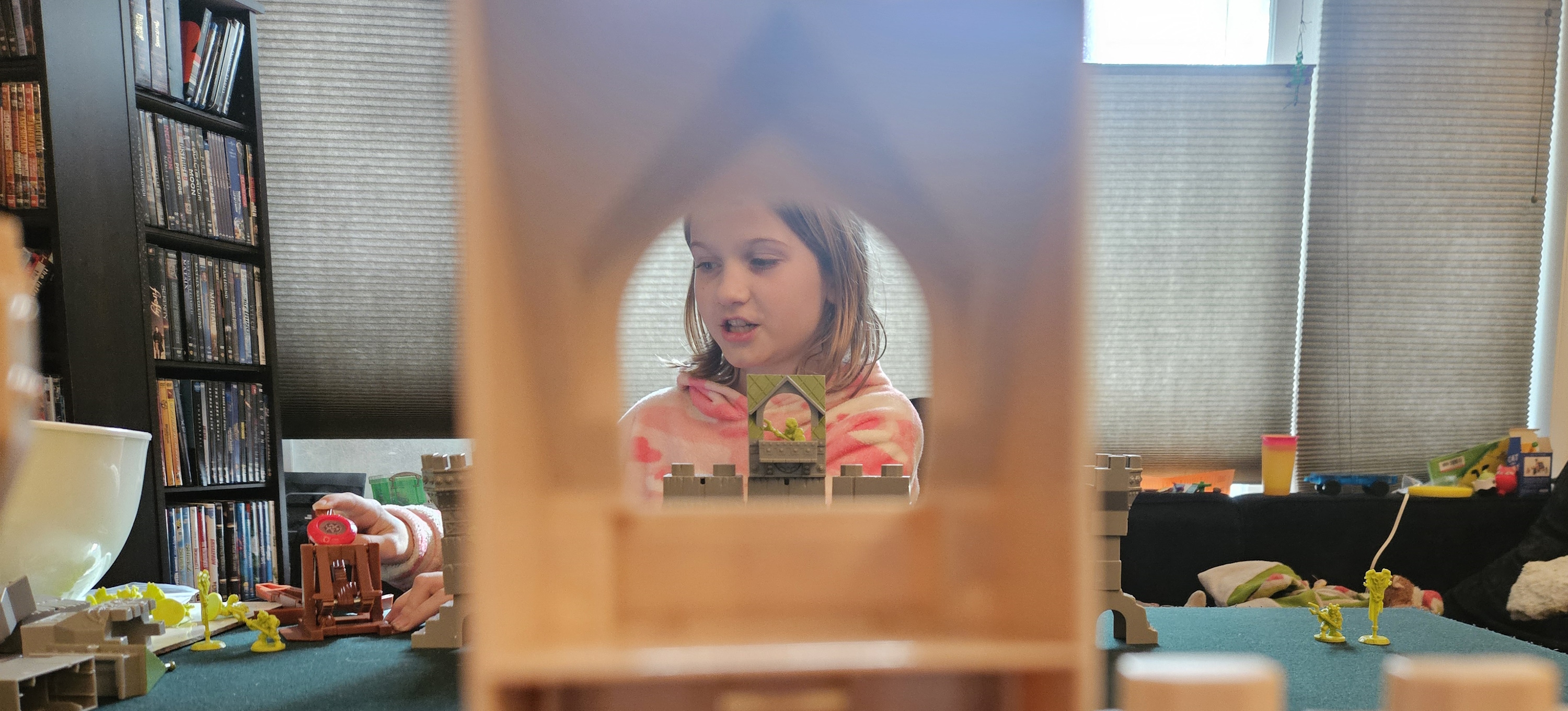 In our first session, my daughter crafted a perfect mirror of my castle, which, it so happens, was a perfect reproduction of the castle in the rulebook. Later, she asked if she could do whatever she liked. Within a few constraints, the answer is yes. She learned the hard way to overlap her stones for greater sturdiness, to insert the little shield-pegs at weak points, to not aspire to too much verticality. Minor details, as engineering lessons go, but essentials nonetheless.