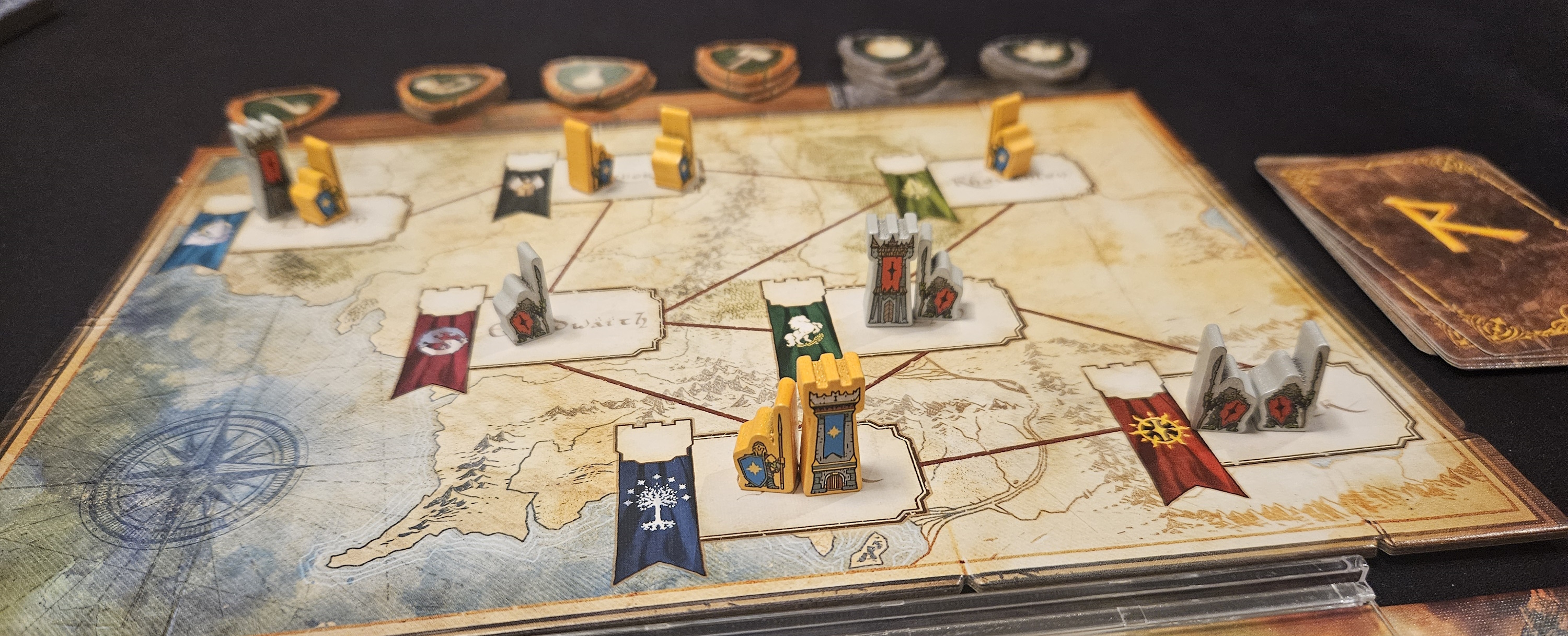 Still, it’s a nice way to pass thirty minutes. Even within its self-imposed constraints, there’s room for expression and strategy. The threefold victory conditions, for instance, elevate the drafting in every sense. One can win either through the aforementioned grand alliance, filling Middle-earth’s seven regions with soldiers or towers, or by obtaining/destroying the One Ring. Naturally, getting ahead in one sphere often means neglecting the others, generating a pleasant tug-of-war.