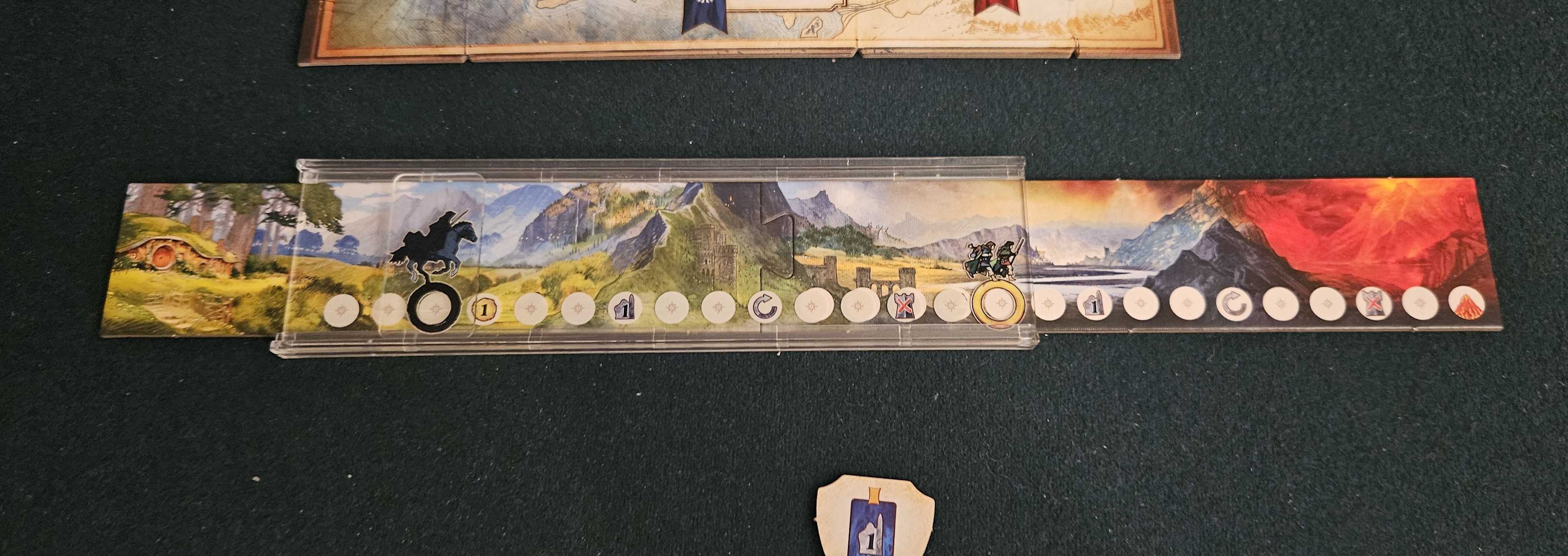 It’s curious, for instance, that the whole game seems pitched toward the Last Alliance, with its Elves, Ents, and Eagles. Humans and Wizards, sure, those guys are more morally wiggly, but there are no trolls or goblins being lured on-side. It doesn’t take too much imagination to fill in the gaps, but the utter symmetry between the Alliance and the Dark Lord somewhat undersells the license. Even the Quest for the One Ring slider, which tracks either Frodo and Sam beelining for Mount Doom or the Nazgûl hot on their heels, is built to appear factional while being in fact identical for both sides. If the pieces weren’t yellow and gray, it would be easy to forget which fate you were espousing for Middle-earth.
