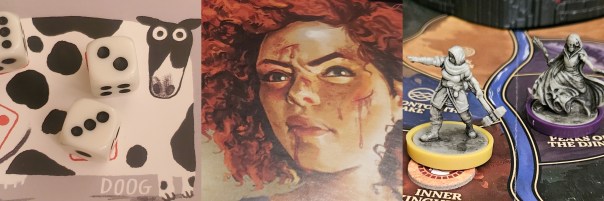 Spots gives you these dogs that need spots, so you try to fill in the dogs’ spots with dice. When you fill out a dog, you turn it over and that dog is done. You need to finish six dogs to win. There are these actions that have roll-a-dice, get-a-bone, get-a-treat, and I think one of them was roll-the-dice-you-buried-in-your-yard. You need to keep less than seven dice in your yard or you lose all the dice on your dogs. When that happens, that’s a sign you should probably re-roll all the dice in your yard more often.