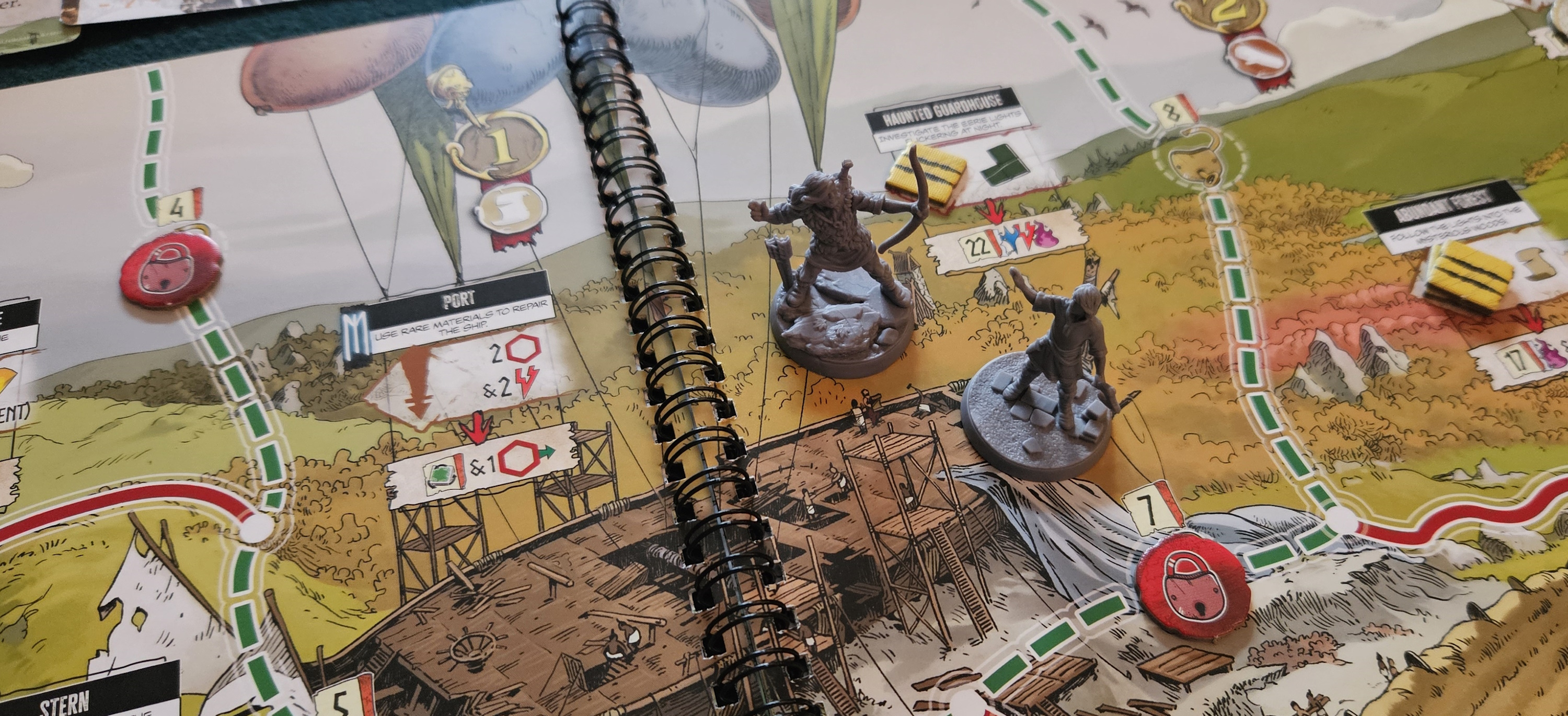 The system underpinning these actions is functional enough to require careful consideration even if it doesn’t make much sense within the logic of the game universe. The gist is that you have a row of action cards, things like fighting, gathering resources, picking up items, moving around the map, and so forth. Each turn allows your crew to alternate placing four discs on these cards to trigger their corresponding effects.