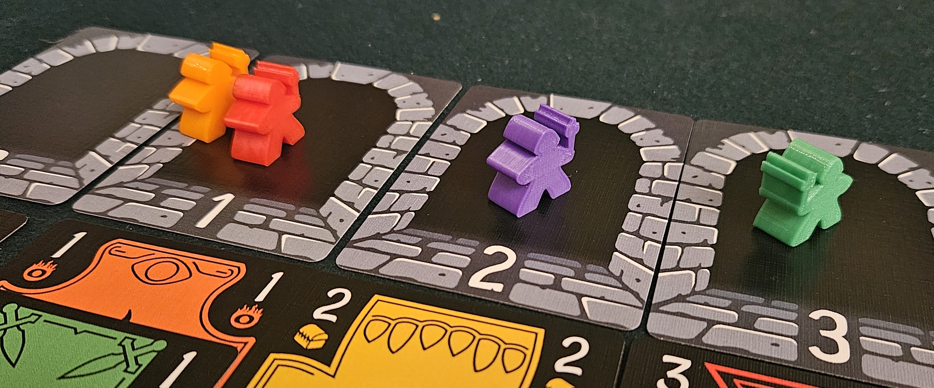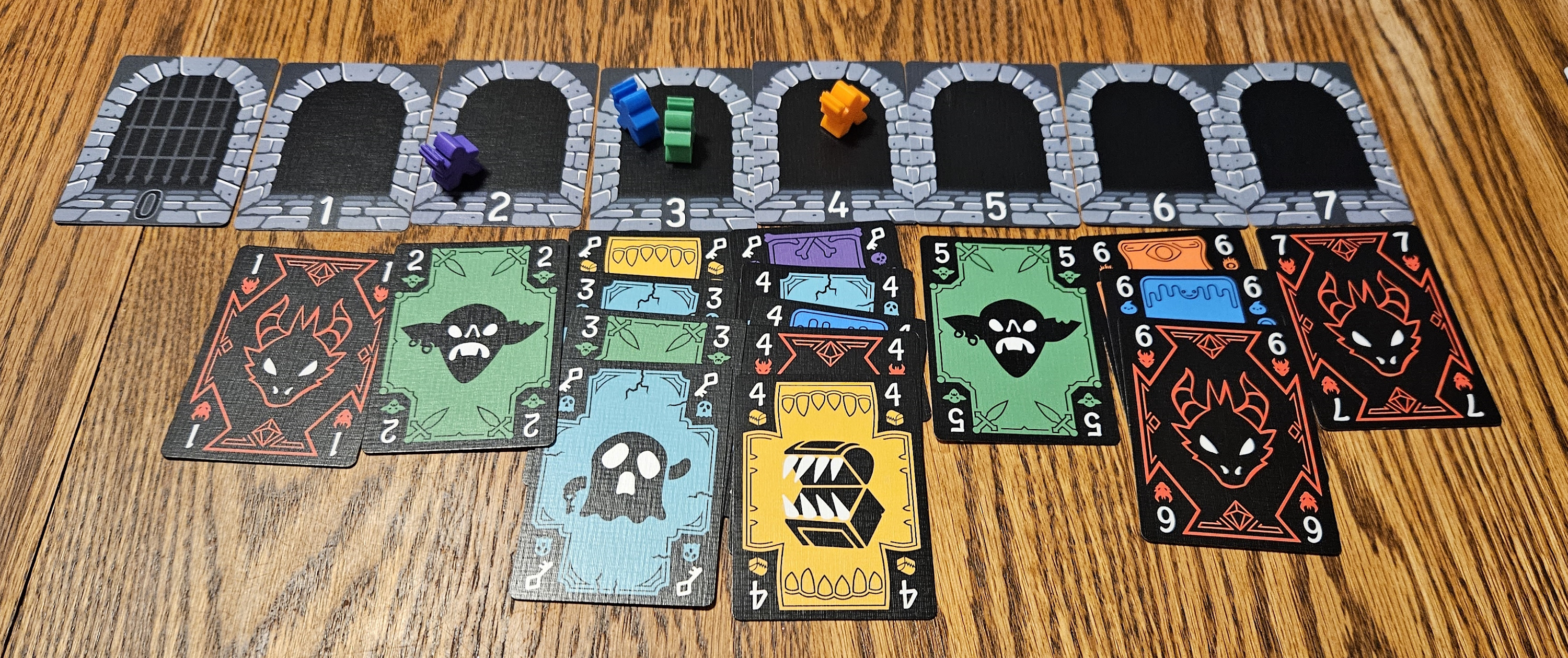 Right away, though, there are some significant departures from the norm. The first is the way Torchlit handles victory. In usual fashion, the winning card is determined by highest trump followed by highest led card. Except that only determines the winning rank. Everybody who played that rank “wins” — which, in this context, means they move their adventurer deeper into the dungeon they’re plundering. There is no tiebreaker. Torchlit doesn’t need one. If everybody plays the same rank, everybody moves forward. Which is a rarity, but I have seen it happen.