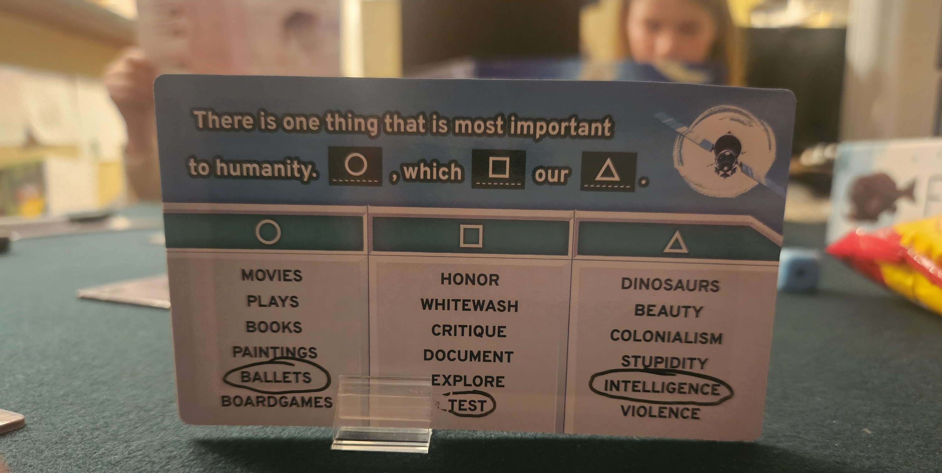 On its own, this process is raw and calculating, potentially even mind-numbing. It isn’t uncommon for the table’s problem-solvers to put their heads together and do the heavy lifting, leaving their associates out in the cold. To some degree, of course, this is a player issue, like quarterbacking or alpha-playerism. But it’s also an issue that A Message from the Stars directly fosters. A more mathematically minded player can explain their reasoning to their fellow players, but these detours are also delays. More than once, I’ve seen a player, left behind, insist that those with a handle on the equation just get on with it so the group can move onto something else.