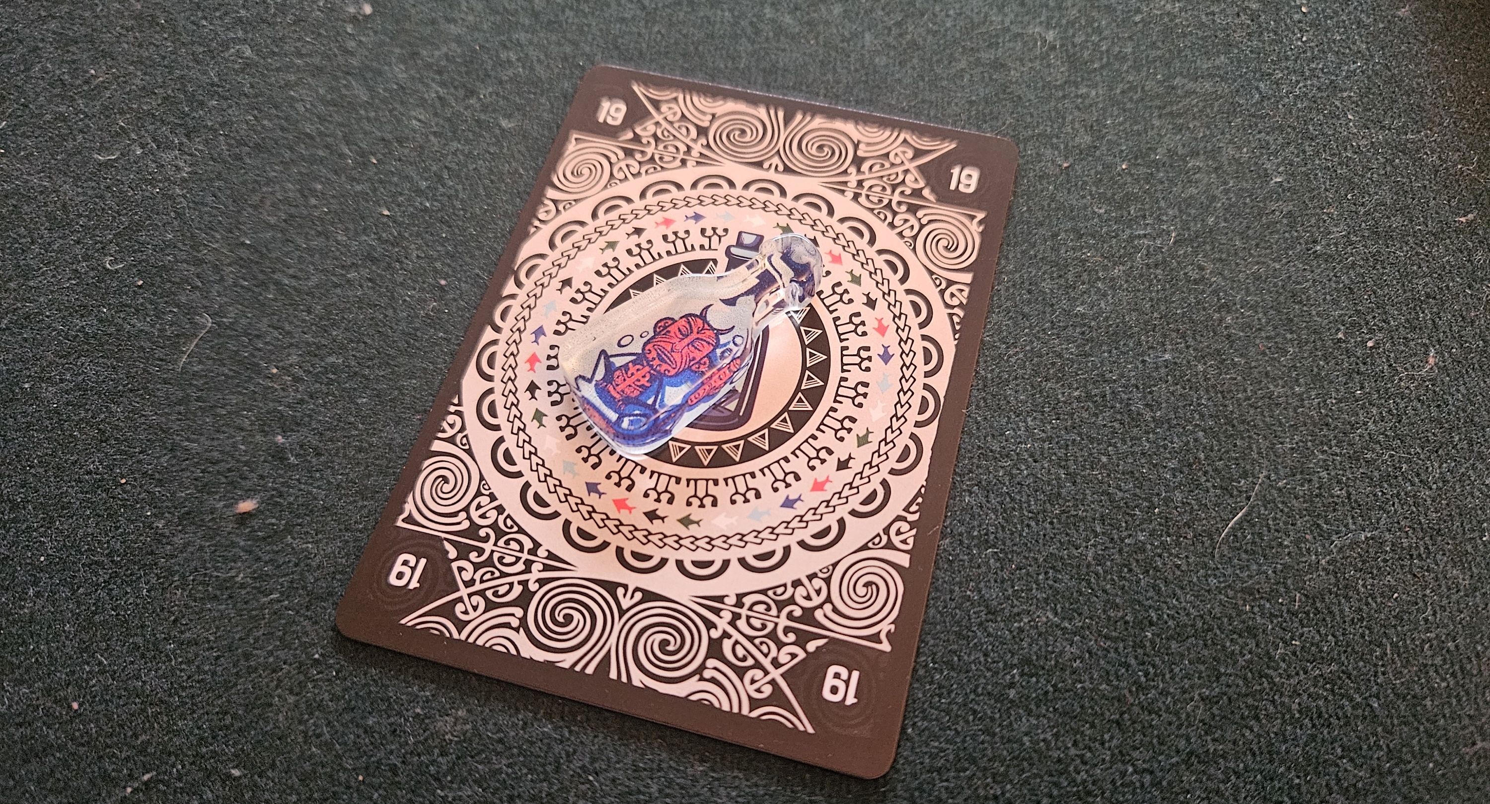 Like most trick-takers, your goal is to take tricks. But rather than falling prey to the tyranny of high numbers, anybody can steal a trick by bidding low. Exactly how low is the lingering question. When the hand begins, the bottle imp — which in this remaster is a lovely resin thing that’s a joy to handle, not to mention also pulling double duty for sessions of spin-the-bottle — has its current price set at 19. Playing a card lower than 19 means the bottle imp is up for grabs. Whoever plays the highest rank below that sale price will steal the entire trick, including all the high-scoring cards other players may have bid. Well done! You just swiped a whole bunch of points!