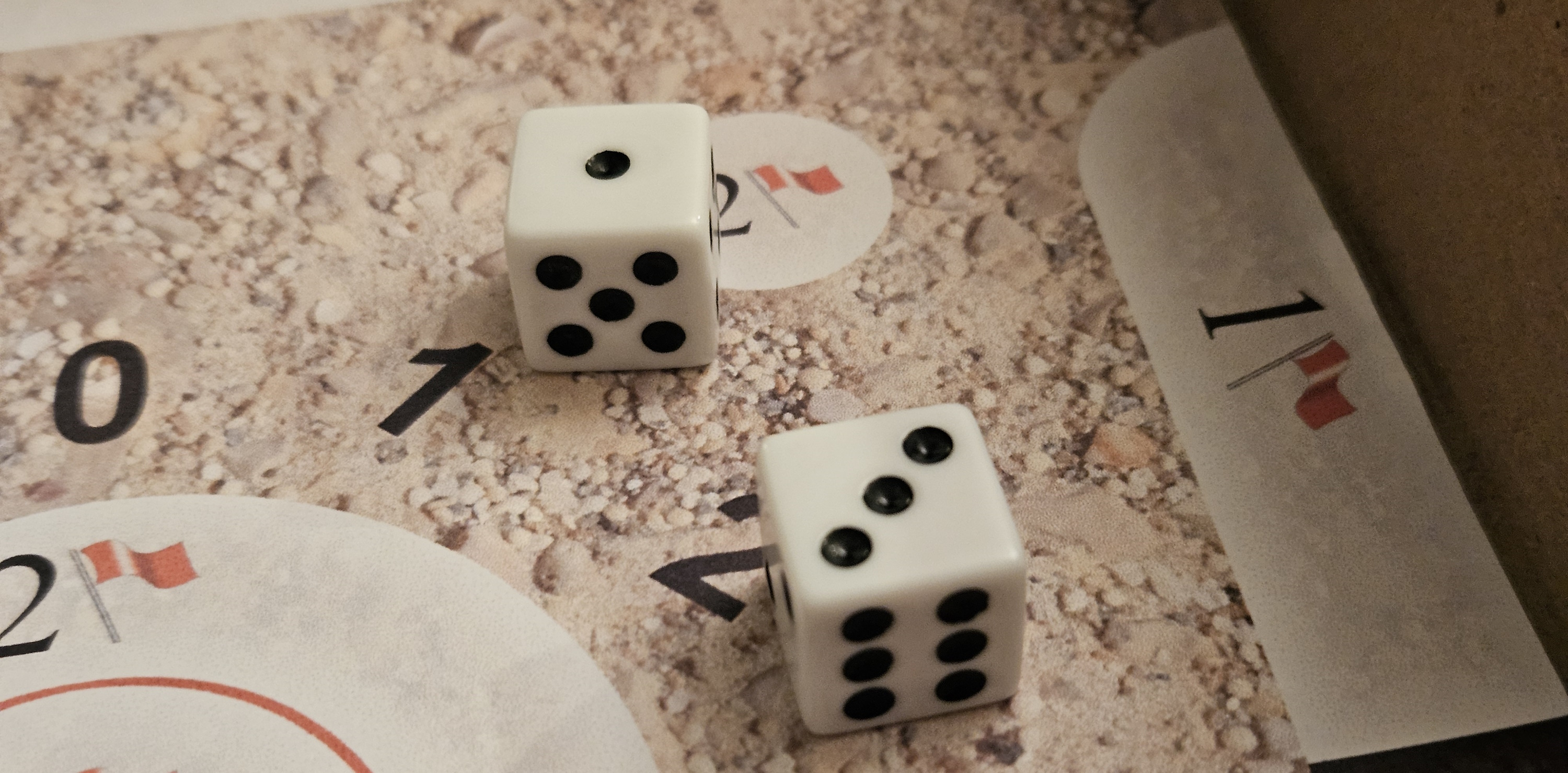 Two of our players become belligerents in war. Both are assigned a color of dice, white or black. To wage war, they simultaneously fling three dice each into the box, ideally rebounding them from their respective back-ends to clatter onto scoring spaces. They will repeat this process three times, first adding another trio of dice, then later removing a few from the box and throwing them again. Their objective is to achieve as high a sum as possible, hopefully overwhelming their opposition’s number. Aiding in this endeavor are a pair of combat cards, one per side, which award additional strength to their owner for rolling specific numbers.