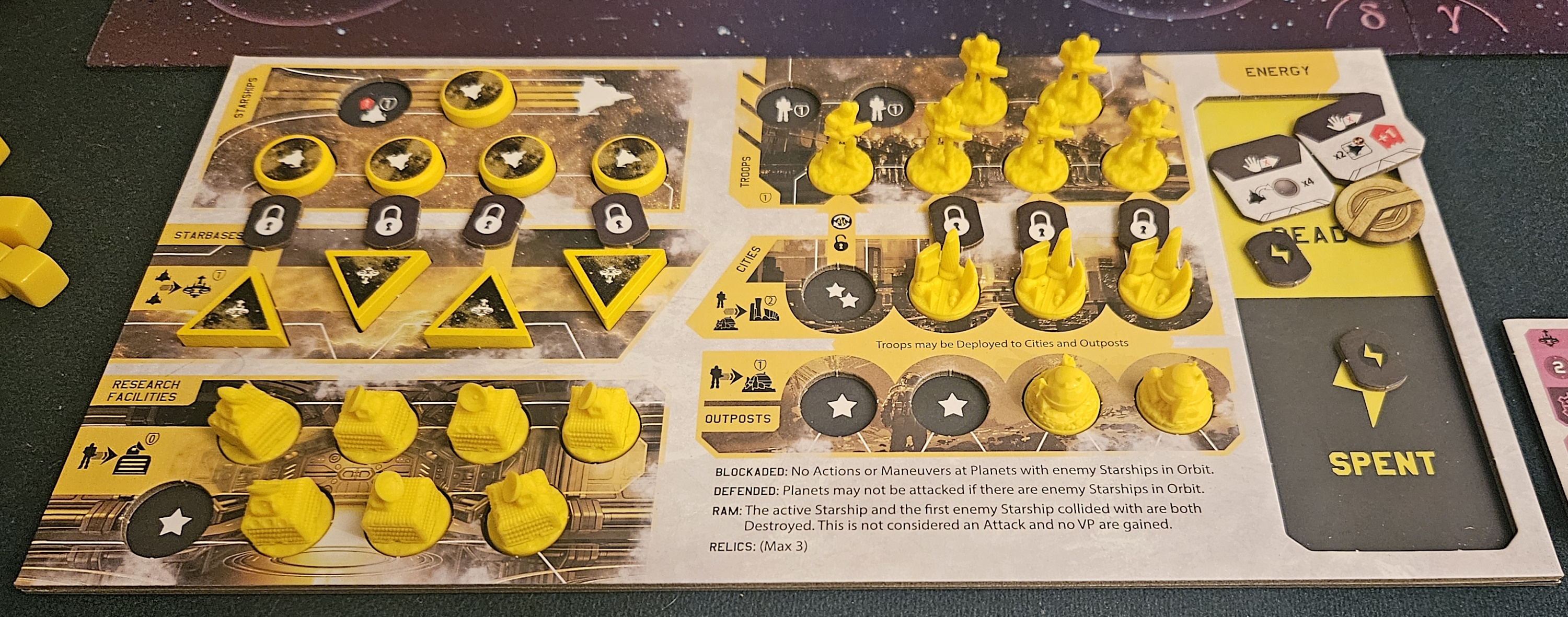 The companion to the Zenith Edition’s improved board is the expanded role of building. Ascending Empires always asked players to settle far-flung worlds, but here those options have been duly expanded. There’s a cycle of life out there. Ships land on planets to become troops. Troops become outposts and cities. Outposts and cities produce troops. Research stations unlock technologies, which alter the rules in various ways. There are bigger warships to unlock, heftier discs that also bring their own perks to the table. A new energy system adds some flexibility to your actions, letting you spend tokens to take extra moves or deploy additional ships. It’s smart, less linear than the original game’s approach to both actions and technology, without really adding much in terms of complexity.