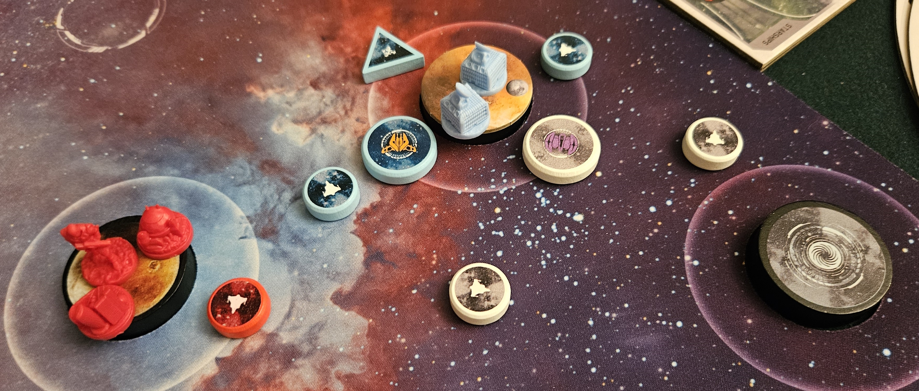 Other little additions are peppered throughout. There are now starbases, the least intuitive inclusion in the whole package. Starbases unlock additional ship discs for you to use, but they don’t actually produce ships. They sit in orbit, but don’t fight in space. Instead, they’re an additional way to protect your planets, both conceptually in that they add a pip to your planet’s defense, and physically on the board. With some clever placement, you can deploy them like gigantic umbrellas, keeping enemy ships at bay. The only problem is that their straight edges don’t tend to rebound rival vessels quite as rigorously as your planet’s rounded shape. Still, they’re a nifty inclusion that adds some texture to your civilization’s expansion into the stars.