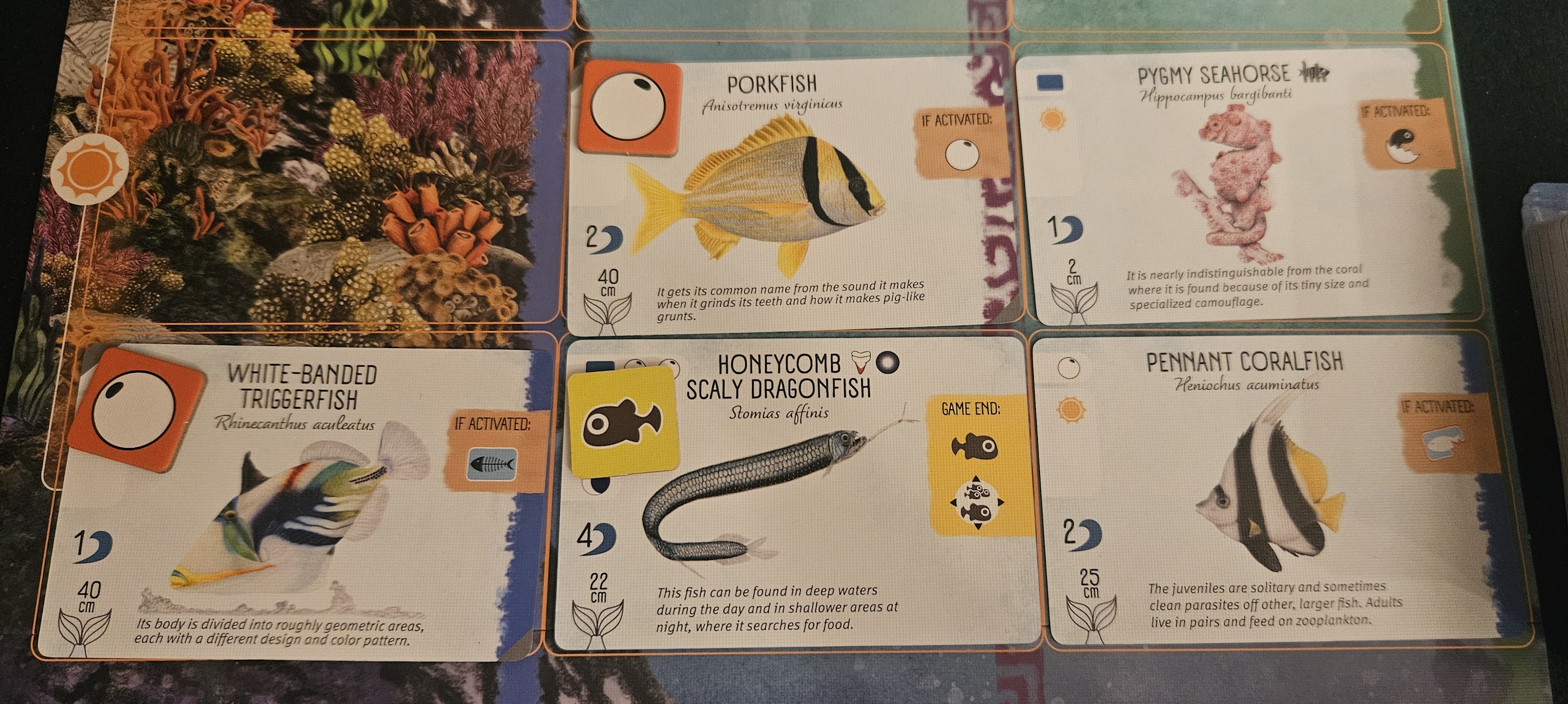 Similarly, as a lower-stakes option, I find that Finspan is a better fit for my multiplayer-solitaire appetite. There are only a few moments of intersection between players, such as when a fish populates everybody’s leftmost column with eggs or allows everybody to move a school to a better location. But these abilities only rarely hinge on other players’ activities. There are no shared pools to draw from, whether card markets or a resource pools, and there’s nothing like Wyrmspan’s guilds. While this reduces the number of active decisions between players, it also keeps the overhead tight. There’s no such occurrence, for example, as when somebody nabs the card you wanted right before your turn.