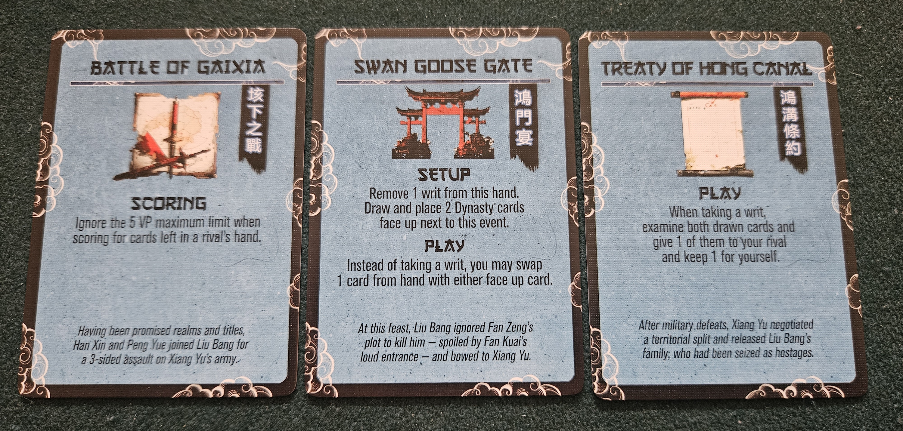 Smartly, the option to accept a writ arrives whenever you need to play. This regularly gooses the tempo and stakes of Chu Han. It feels a little bit like the metagaming in Jon Perry’s supernal Air, Land, & Sea, rewarding players who know when to fold and when to accept some extra risk to potentially swing a trick’s momentum in their favor.