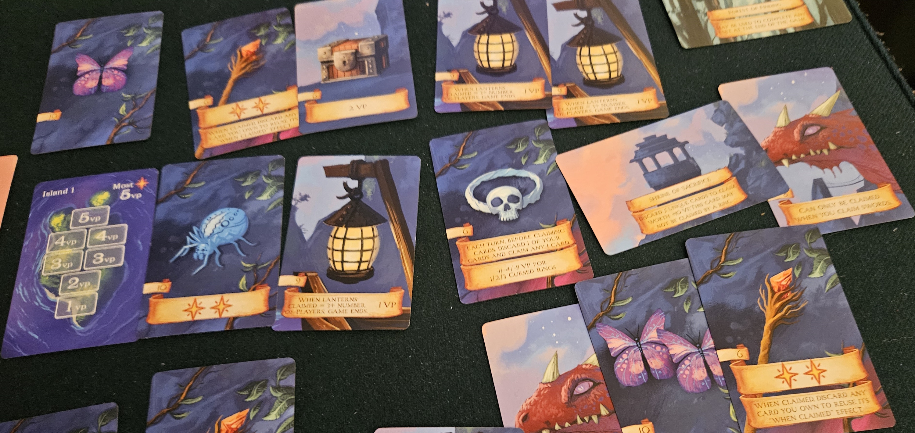 Meanwhile, the actual value of these cards is negotiable. Oh, some cards are straightforward. Say, two points for a treasure chest or one per lantern. But others are tied to a rubric that’s randomized with each session. Three butterflies might be worth five points now, but zero points the next time you play.