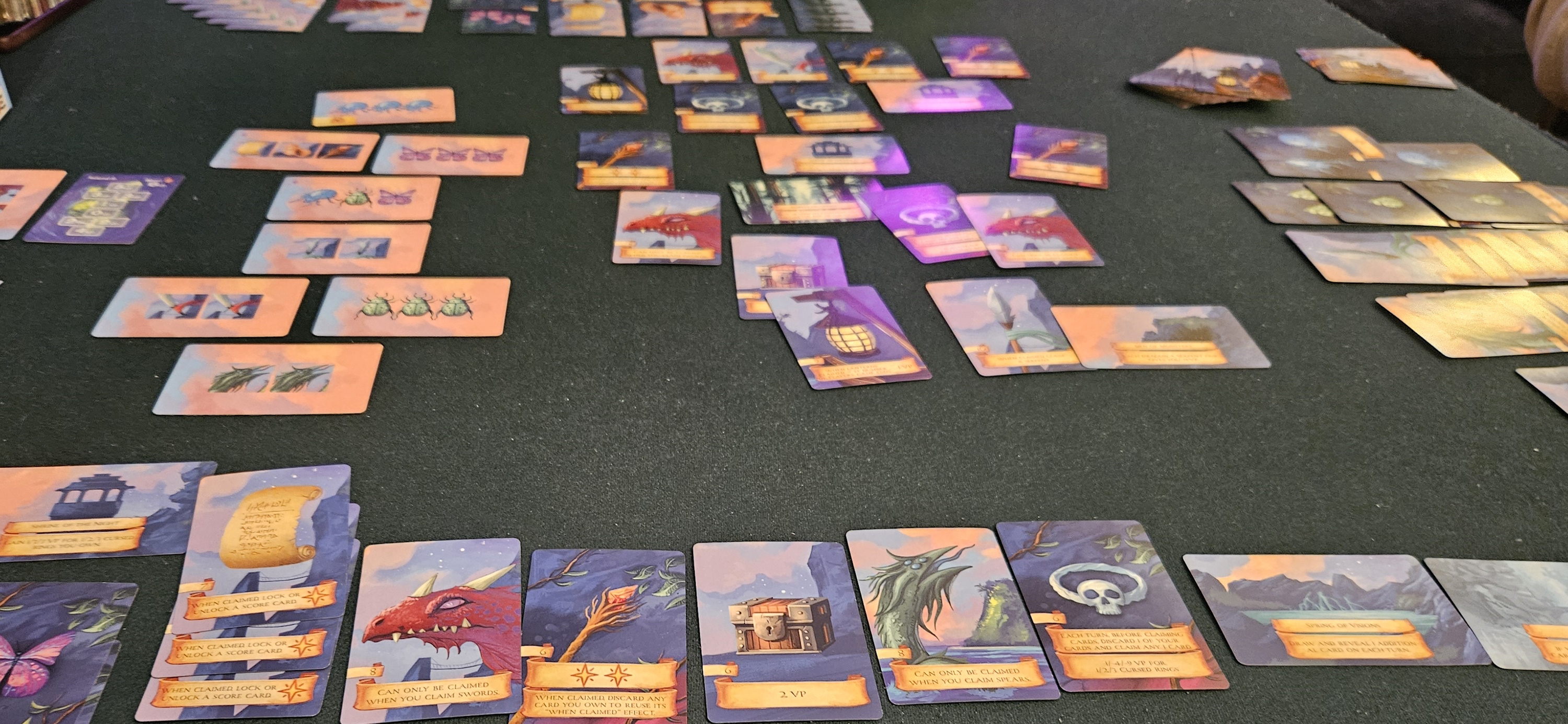 This adds some bite to what would otherwise be a fairly rote process. Even if you aren’t trying to collect spiders, the sudden appearance of five spider cards can present an unusual opportunity. This extends to other card types as well. Dragons and serpents, for example, can only be collected by picking up swords and spears, forcing players to think opportunistically. Staves are powerful, but also force you to discard something else you’ve collected. Cursed rings subtract points, but make it easier to tailor your collection over multiple rounds.
