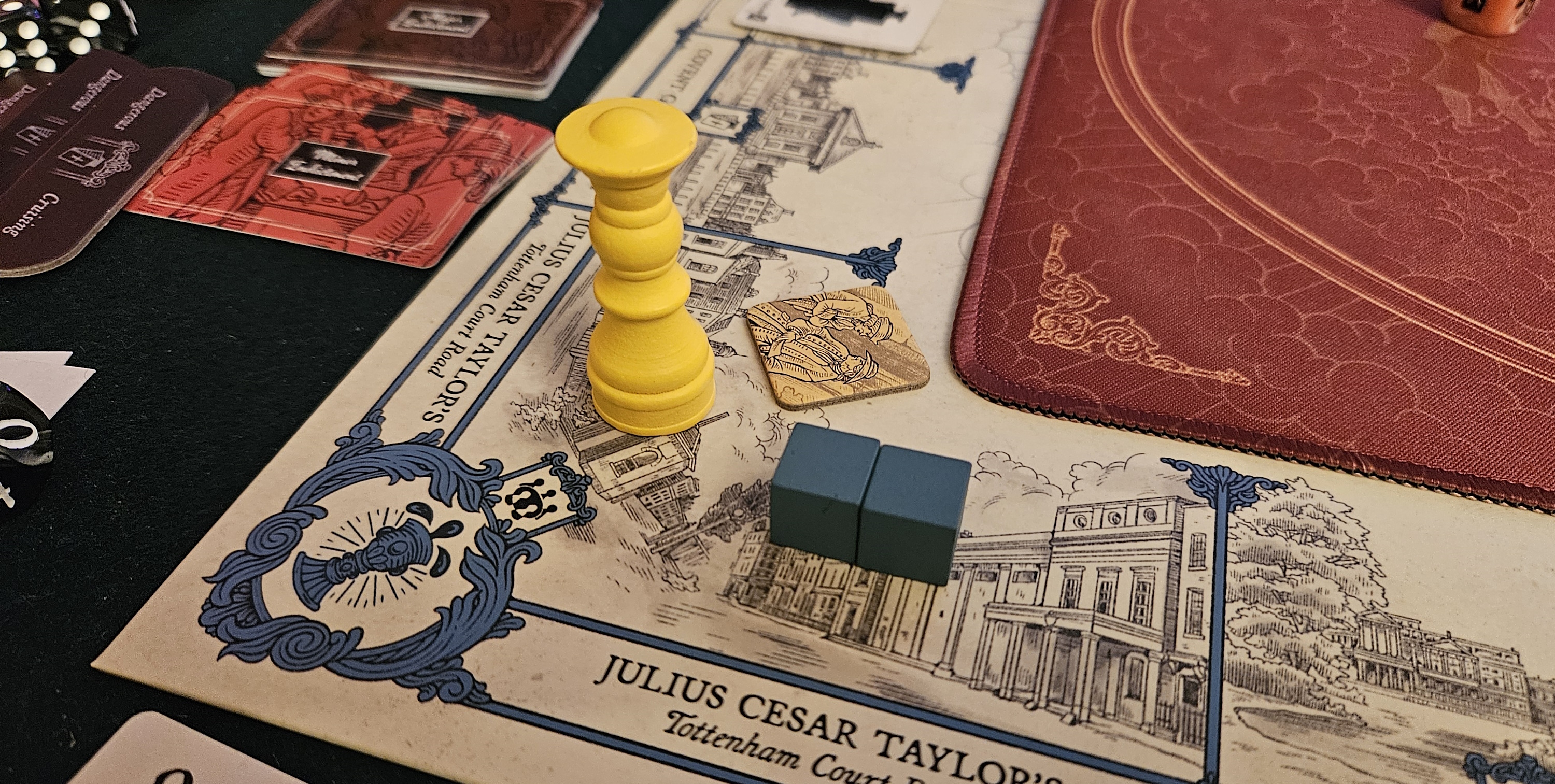 In the intervening months, the game has transformed. As before, most turns are simple, but the method underlying them has changed. Players roll two dice to determine how far they can move. This is more flexible than it might sound. Movement allowances hew closer to Talisman than Monopoly, your gentleman journeying either clockwise or counterclockwise. Moreover, you are free to use both dice together or only one of the pair. Often, this affords plenty of room to pick your destination.