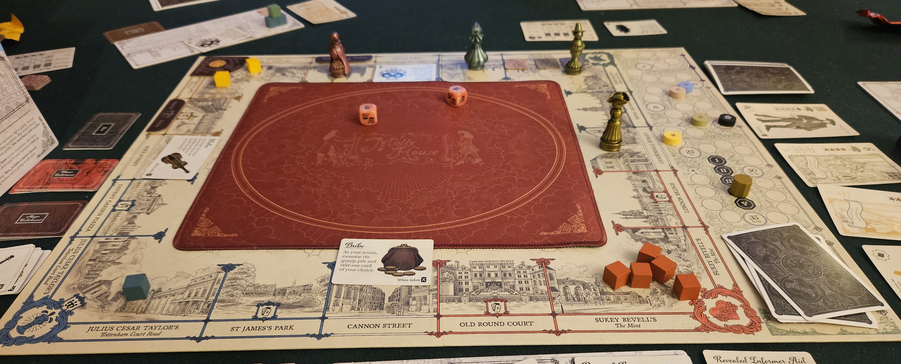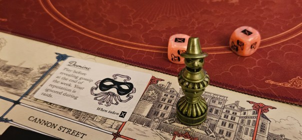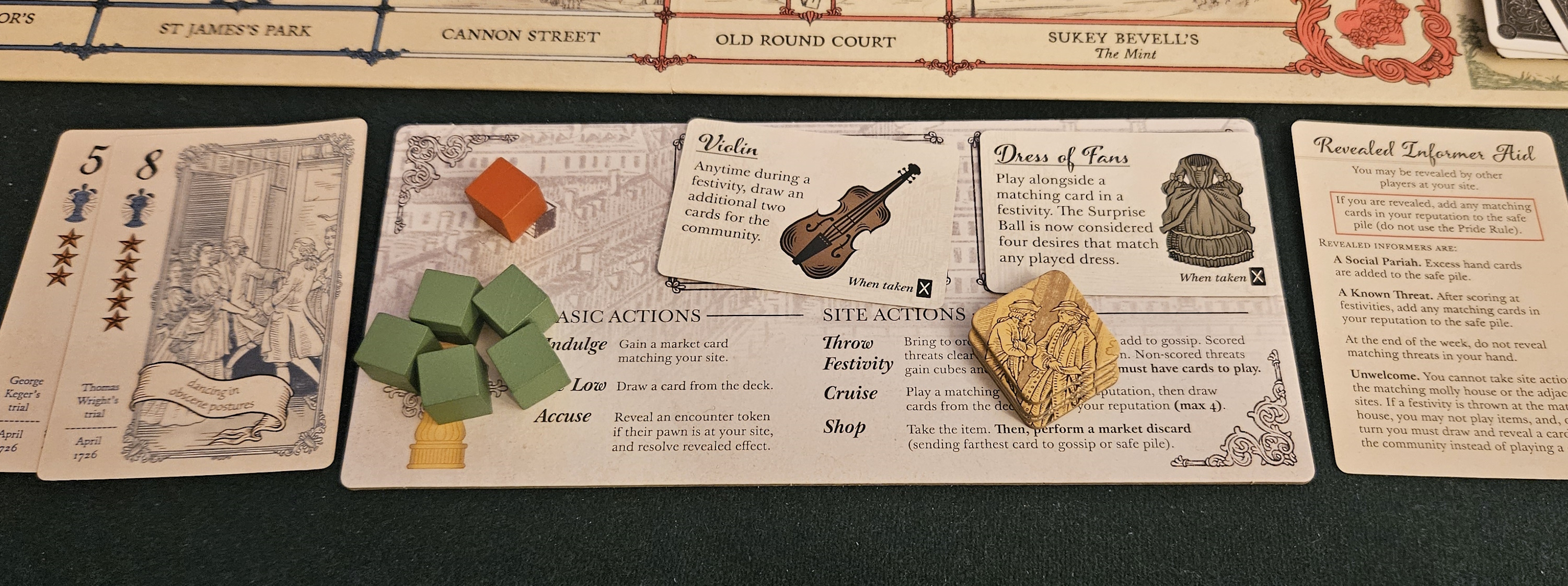 The centerpiece of the design, and the reason for all those accumulated cards, is the festivity. These are only permitted when you visit a molly house, one of the destinations at the board’s corners. This is the main way you will score “joy,” the game’s label for victory points, but it’s also another opportunity for unwanted exposure and attention from the constables.