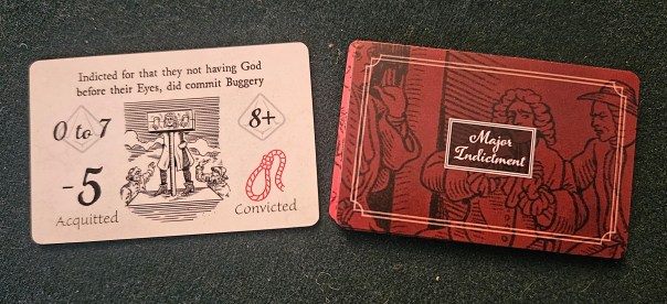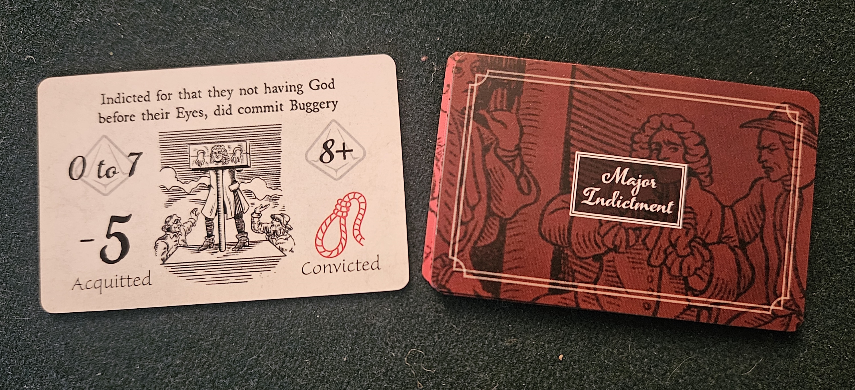 Around the bend, there is still the potential for joy. Until the last of the molly houses is shut down, the glimmer of hope that marks those early moments is never fully thrown into darkness. But the festival atmosphere does grow more muted. Depending on your reputation, the raiding of a molly house may result in an indictment. These pose an indignity that will be familiar to anyone who cursed the retirement rolls of John Company. When the game ends, acquittal is possible, although it will still diminish your joy. Conviction, on the other hand, will reduce your score even further — and may thread your character’s neck through a noose. In other words, your fate is once again cast out onto the streets to be determined by a mere roll of the dice.