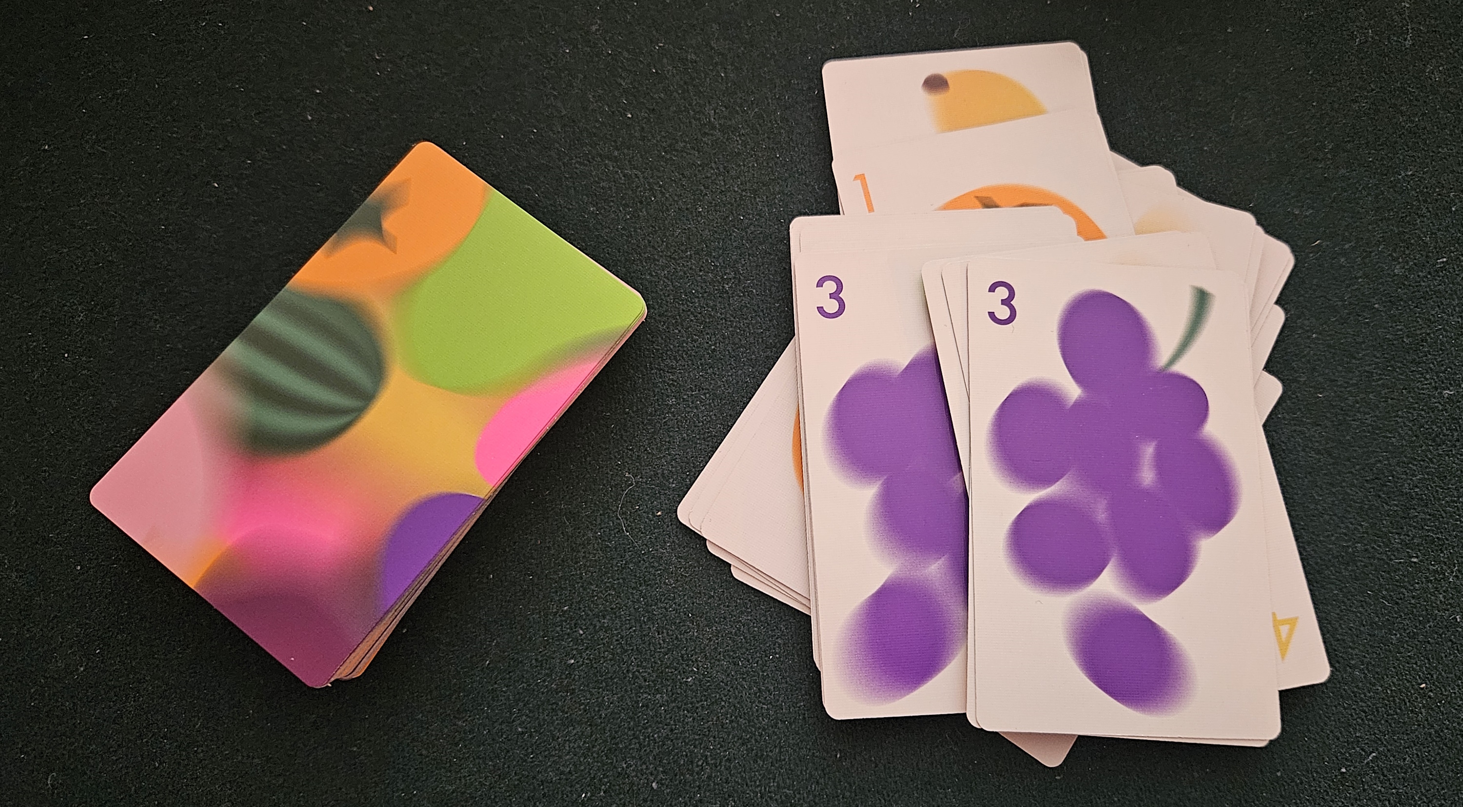 Which brings us around to Fruit Fight’s sole consideration: do you draw again or hold what you’ve got? Drawing might increase your potential take, but similarly increases both the odds that you’ll bust and the volume of fruit that you’ll have for other players to steal. These calculations are aided by varying card quantities. For the lower-scoring fruits, there are eleven copies of each card. For the higher-scoring cards, there are only seven. Let that influence your decisions as it will.