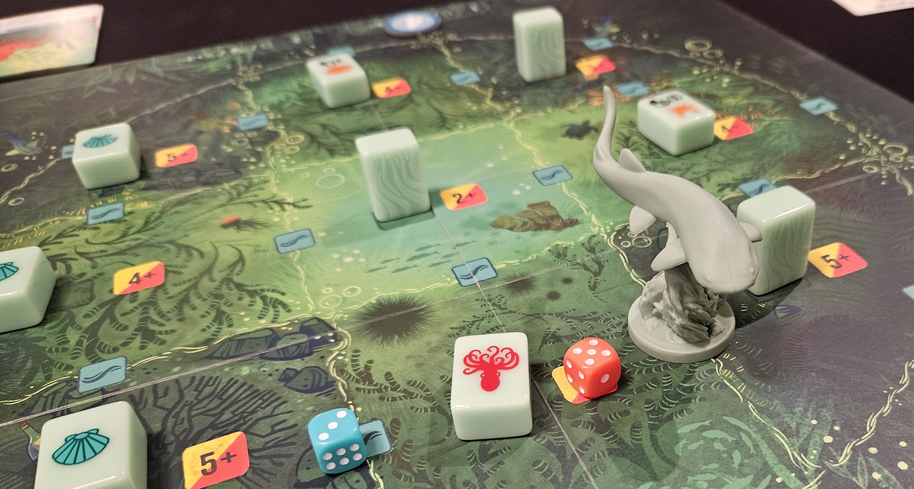 Where the Octopus is afforded quite a bit of control over its actions, limited mostly by the sequence of cards it draws from its deck, the Shark runs on instinct. Each turn, the Shark draws a pair of dice from its bag and rolls them. Depending on the color of these dice, the Shark can either ride the currents to move around the map faster, nuzzle the kelp for a glimpse of what’s hidden behind those blocks, or lash out in a burst of violence. It’s possible, with some blend of dice-luck and card-luck, to kill the Octopus outright, even fairly early in the game.