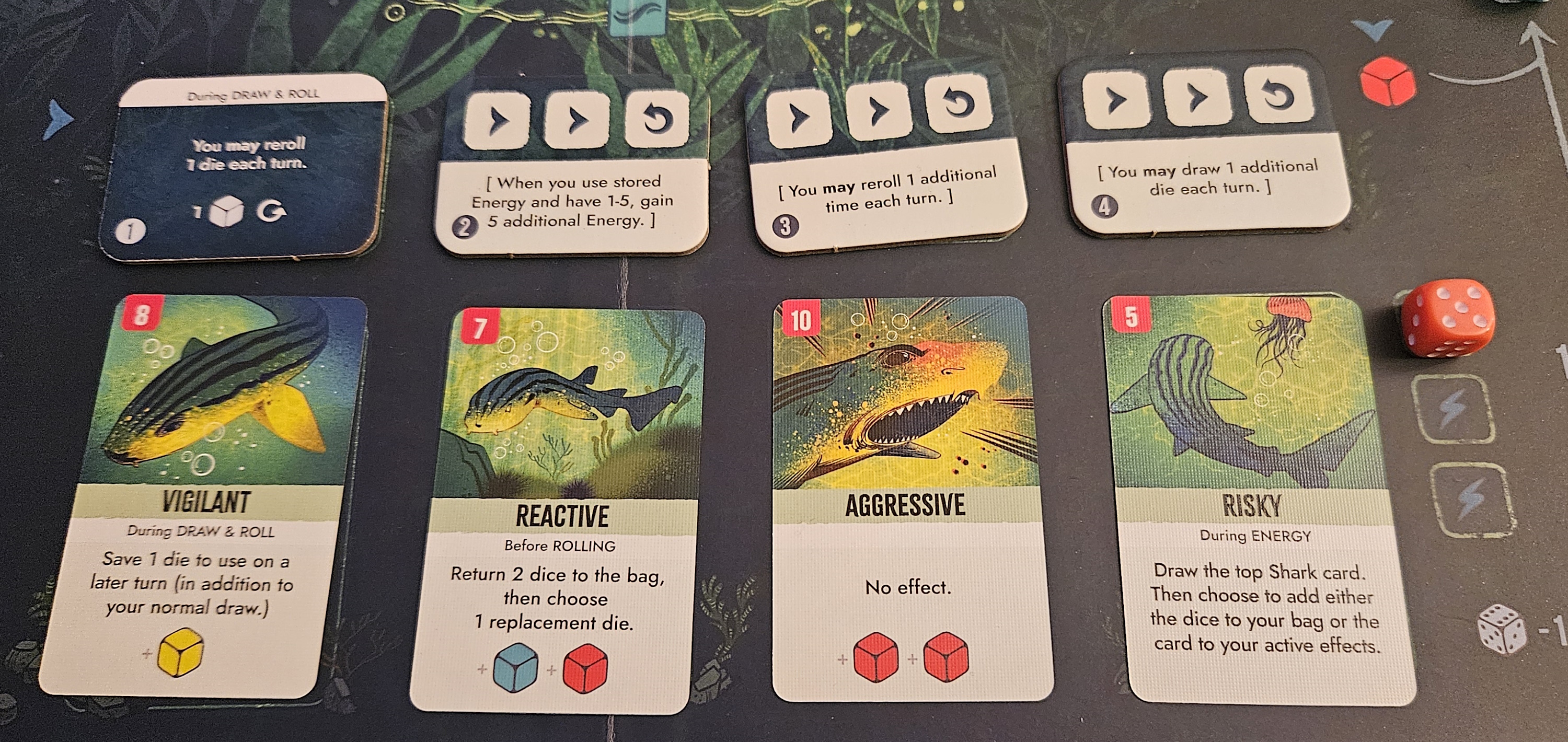 When it comes to things like movement and attacks, the gist is easy enough to sum up. As the Octopus, you’re playing a deck-builder and shell game, shifting hidden blocks between those nine spaces while also learning new skills to better slink, camouflage, and hunt smaller prey. As the Shark, you’re playing a bag-building and dice-rolling game, riding the currents and prodding your nose into places it is almost certainly unwelcome. Simple.