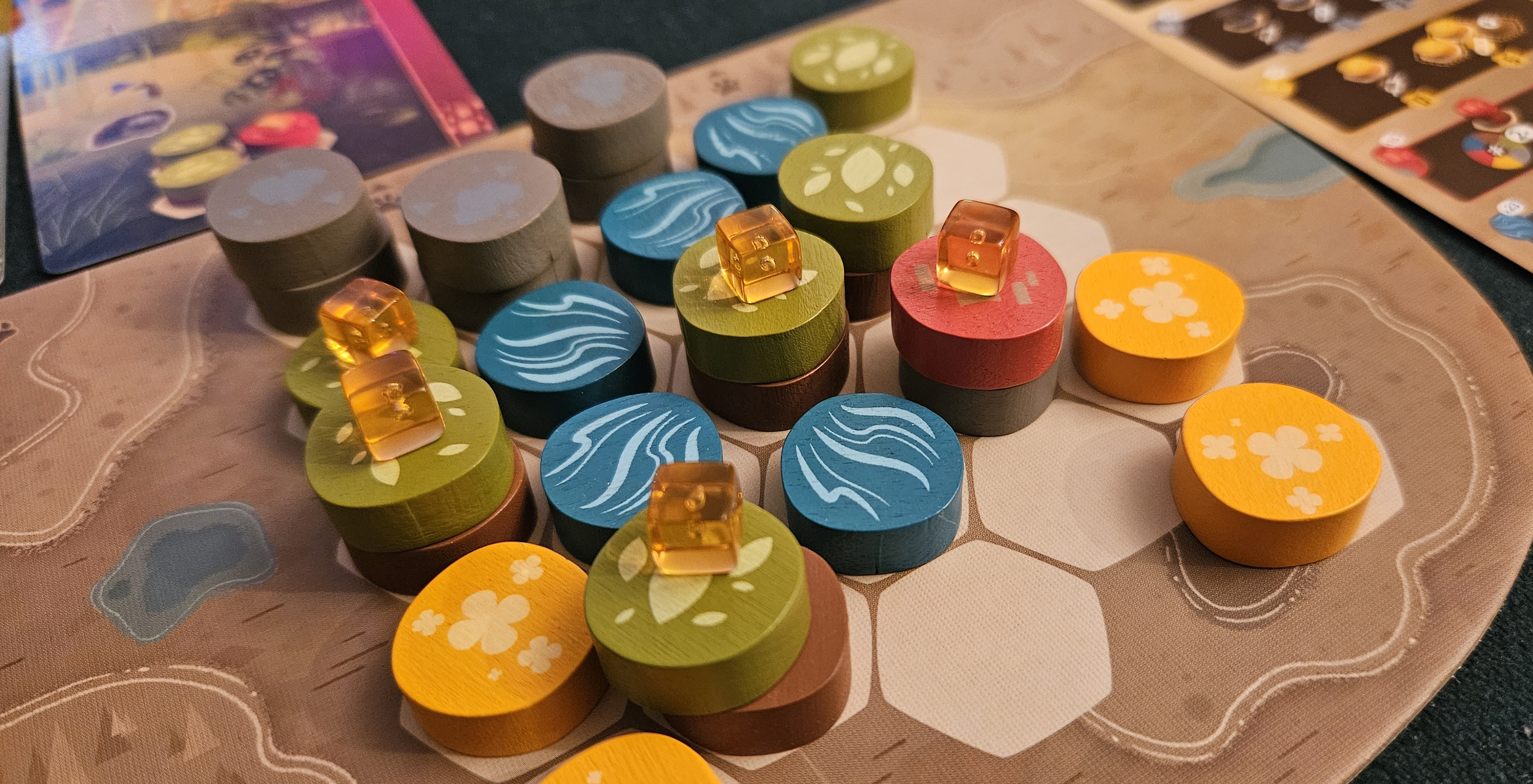 Dan: I get more of a Saint Francis feel, personally. The whole thing is so wholesome and inviting. Which brings me back around to what I was saying earlier about eating humble pie. Because Harmonies looks nice, but it’s also nice on the inside. It feels good on the fingertips. Placing those discs, seeing this landscape take shape, filling it with creatures. They’re only cubes, but the parameters behind their placement are so specific, the illustrations on the cards so pleasing, that it hardly matters.