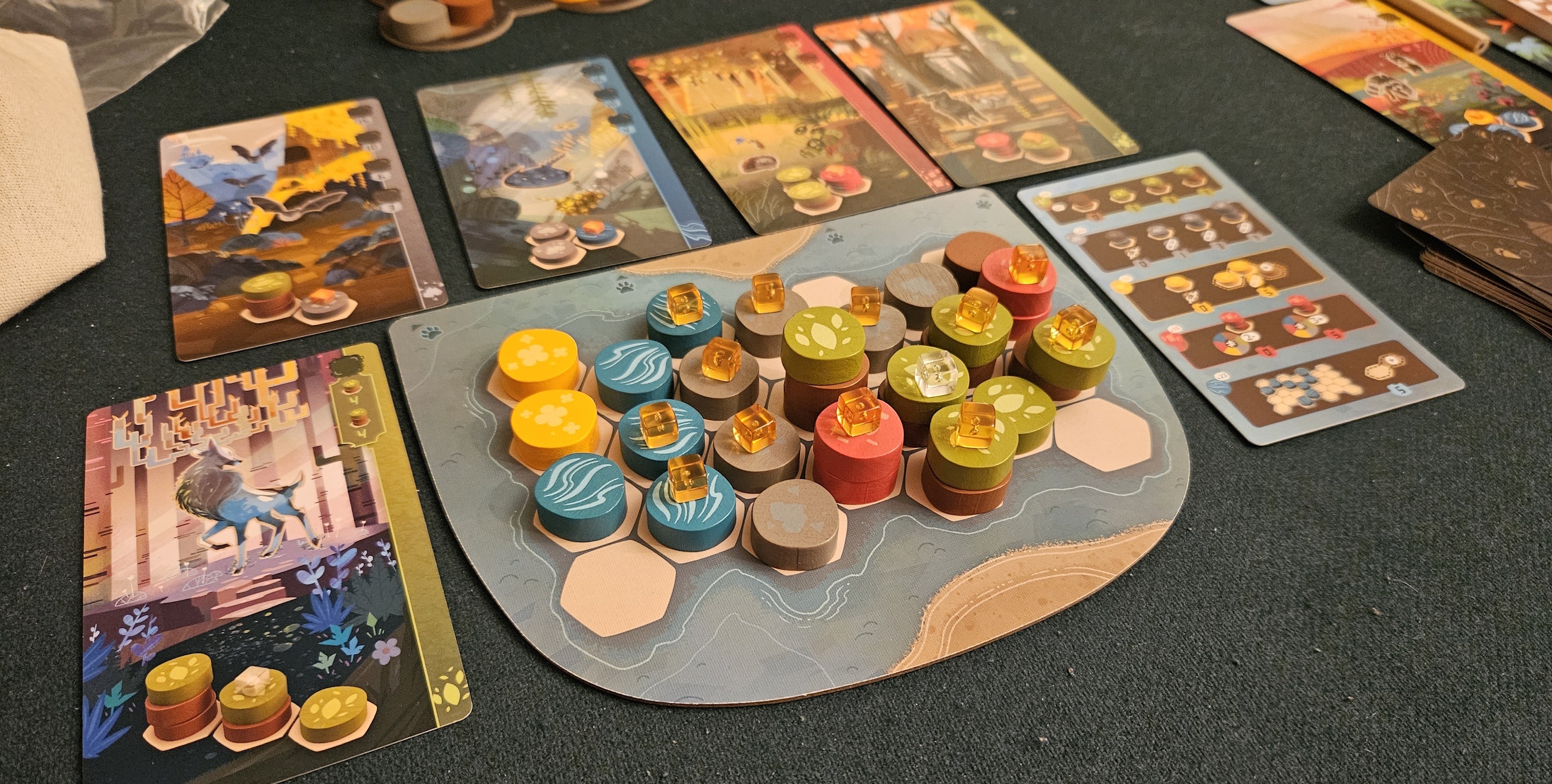 But now for the real reason I brought you here: this time we’re talking Harmonies! Designed by Johan Benvenuto, this pretty little nature game took 2024 by storm. It was included on the Spiel des Jahres Recommended list, and captured many minds and hearts with its chunky, river-rock-esque pieces and winsome box.