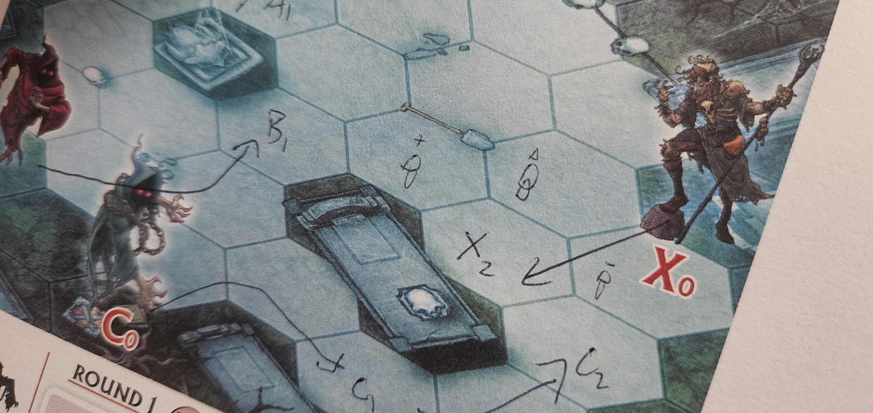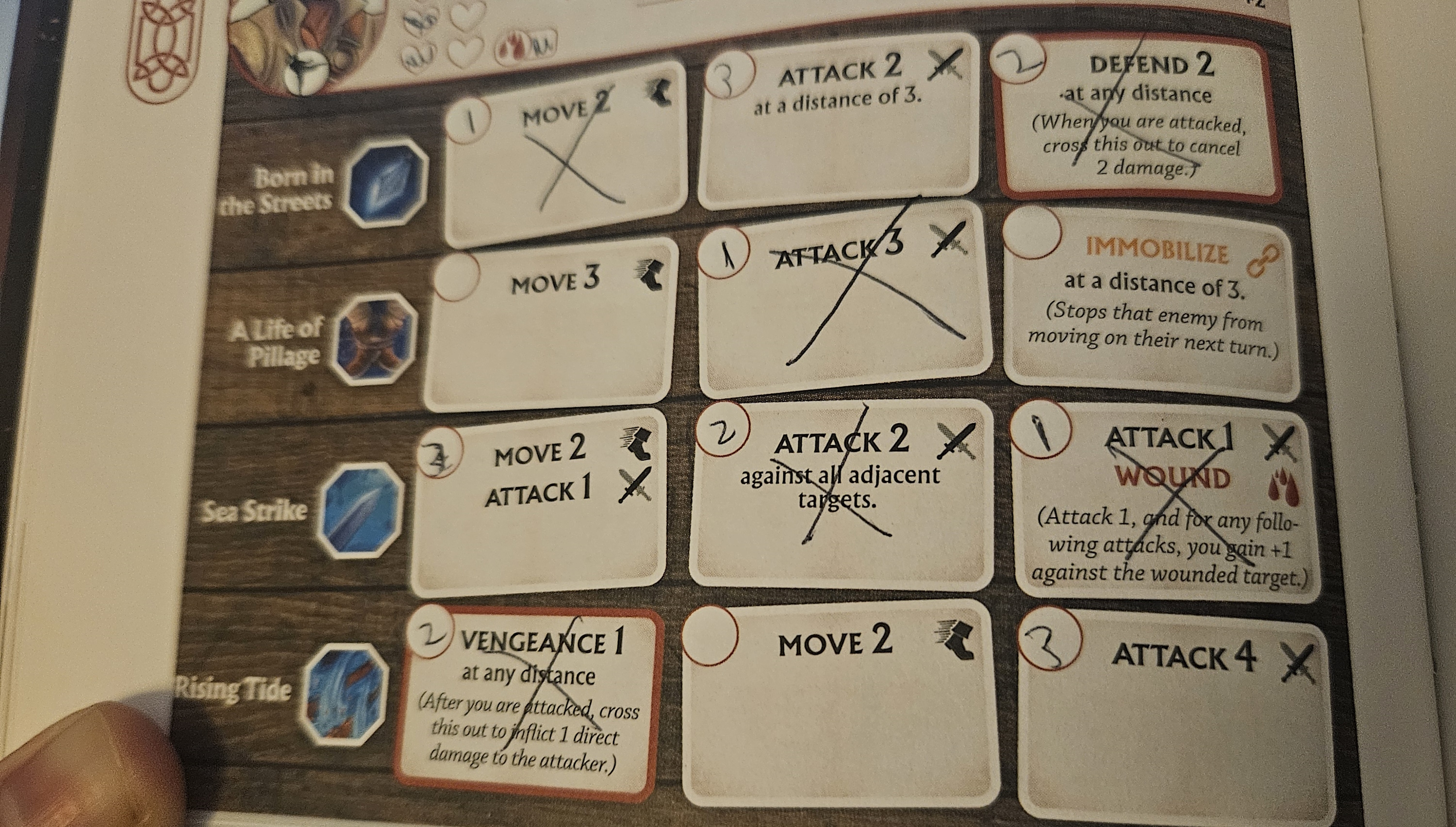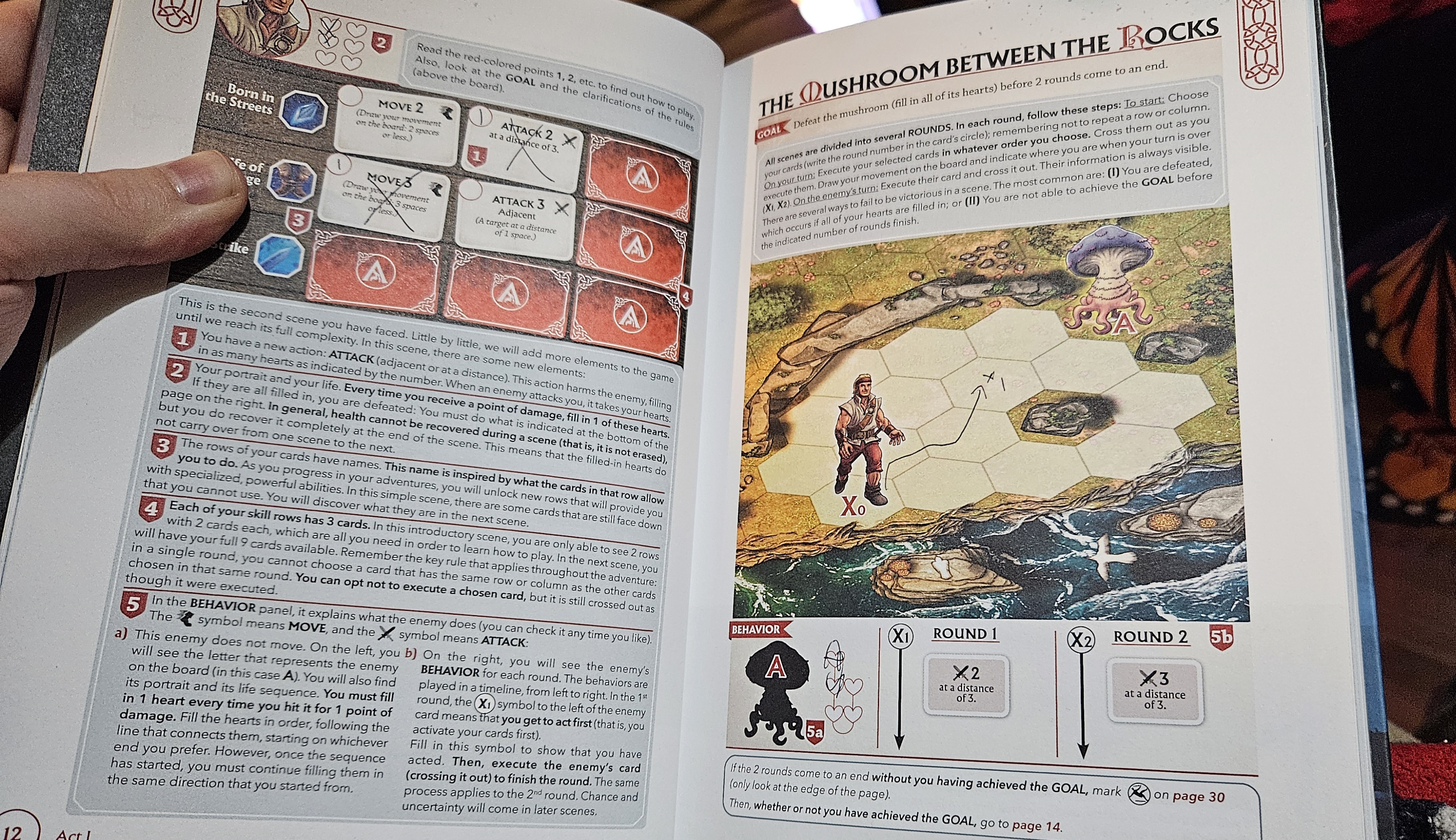 The centerpiece of these battles is a card system that’s printed directly onto the top left of each encounter. At first, your character has three rows of cards, although new unlocks gradually permit a fourth and fifth row. These represent the moves, attacks, and special abilities your character can unleash on their foes. Movement has you scrawl little arrows onto the hex grid, attacks scratch out your opponent’s hearts, and there are little status effects like wounds and immobilization for tweaking enemy behavior.