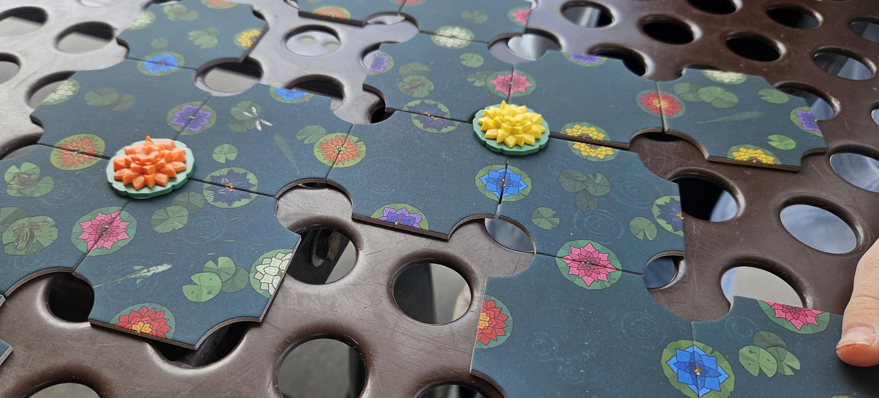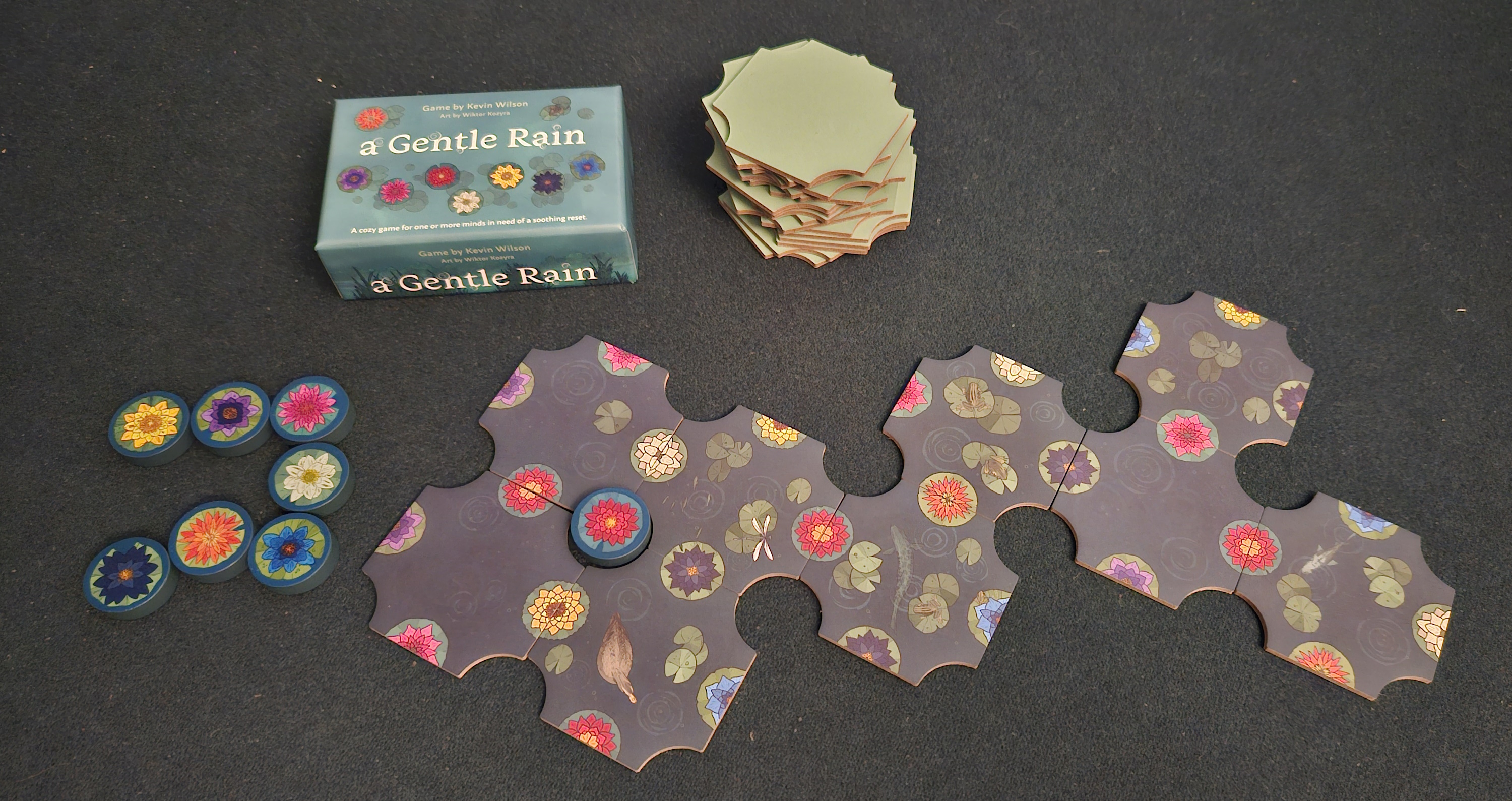 It’s simple. So simple that even descriptors like “elegant” don’t quite suit it. There are some glimmers of strategy. Tiles never show two blossoms of the same color, so putting matching corners near one another is a misstep. Beyond that, A Gentle Rain isn’t a cerebral game, nor is it demanding in the traditional sense. When I played it that first time, trading placements with a friend, we remarked that it must function best as a solitaire game despite the count (1+) advertised on the side of the box.