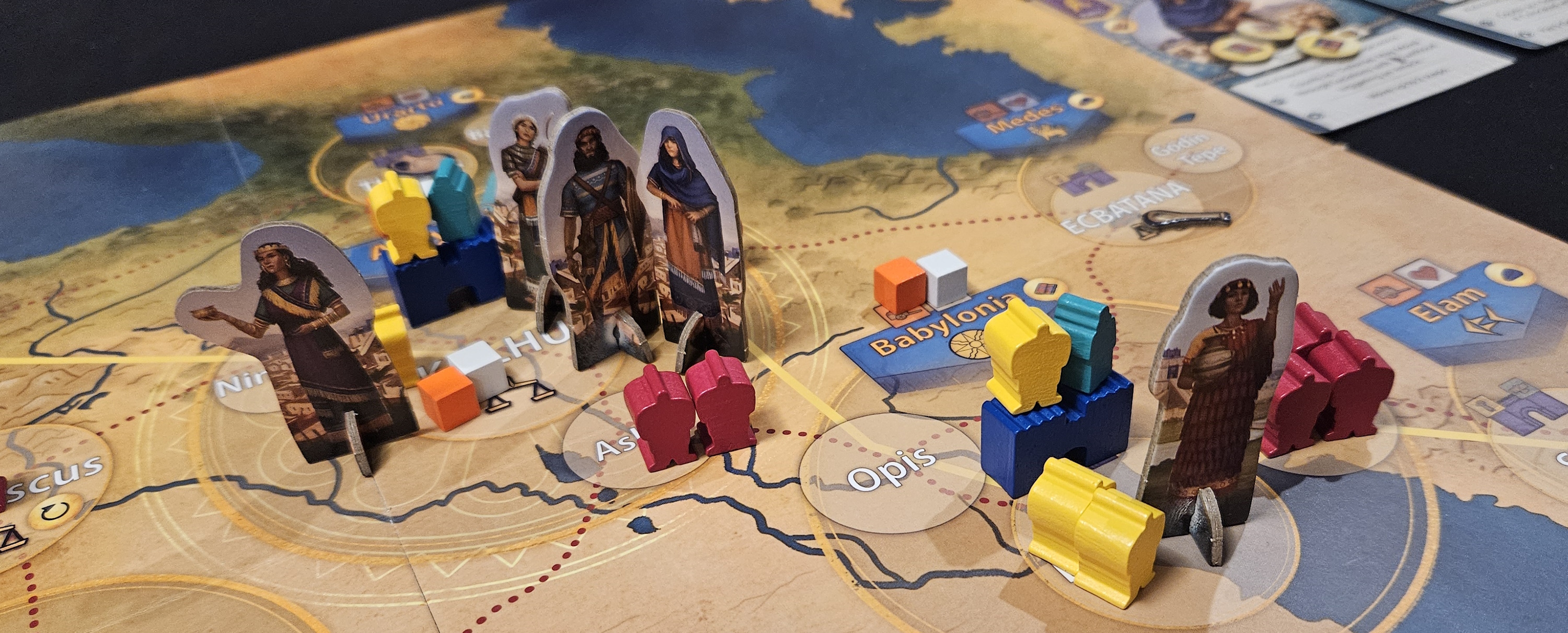 I say “seems” because the sources are thin on the ground — a few stelae here, some woman-queen legends there, all par for the course for an empire nearly three thousand years removed from our present circumstances — but historians largely agree that Sammu-ramat held an unusual position of prominence. This is a world I would love to see explored in detail, packed as it is with court intrigues, military campaigns, and early empire-making, not to mention the prospect of a queen bending that empire to her will. Unfortunately, this board game rendition of Sammu-ramat’s life leaves its most pressing questions unanswered.