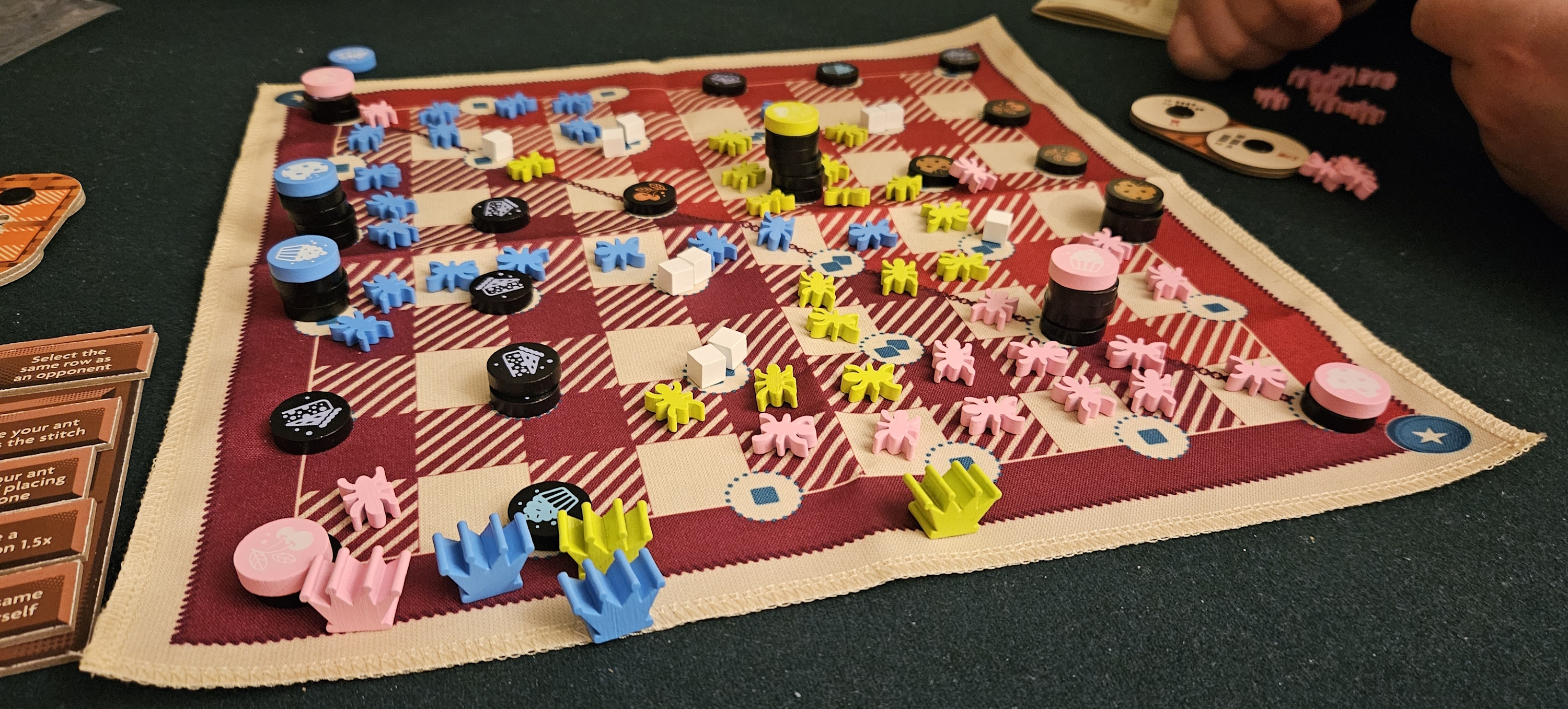 More than that, placing ants is a stickier proposition than you might imagine. The entire turn structure of Gingham is an odd duck. Players place their queens along one edge of the blanket to determine where their ants can go, which later becomes the turn order for the next round of placements. It’s easiest to think of this as a dual bid. Each queen determines potential placements, and placing your queen farther from the “seam” of the blanket affords greater latitude in where your ants can be deployed. But being located closer to the seam of the blanket means you’ll go earlier in turn order next time, potentially even choosing which side of the blanket will get priority. Like everything else in Gingham, it’s an intriguing but knotty headspace, offering both short- and long-term anxieties.