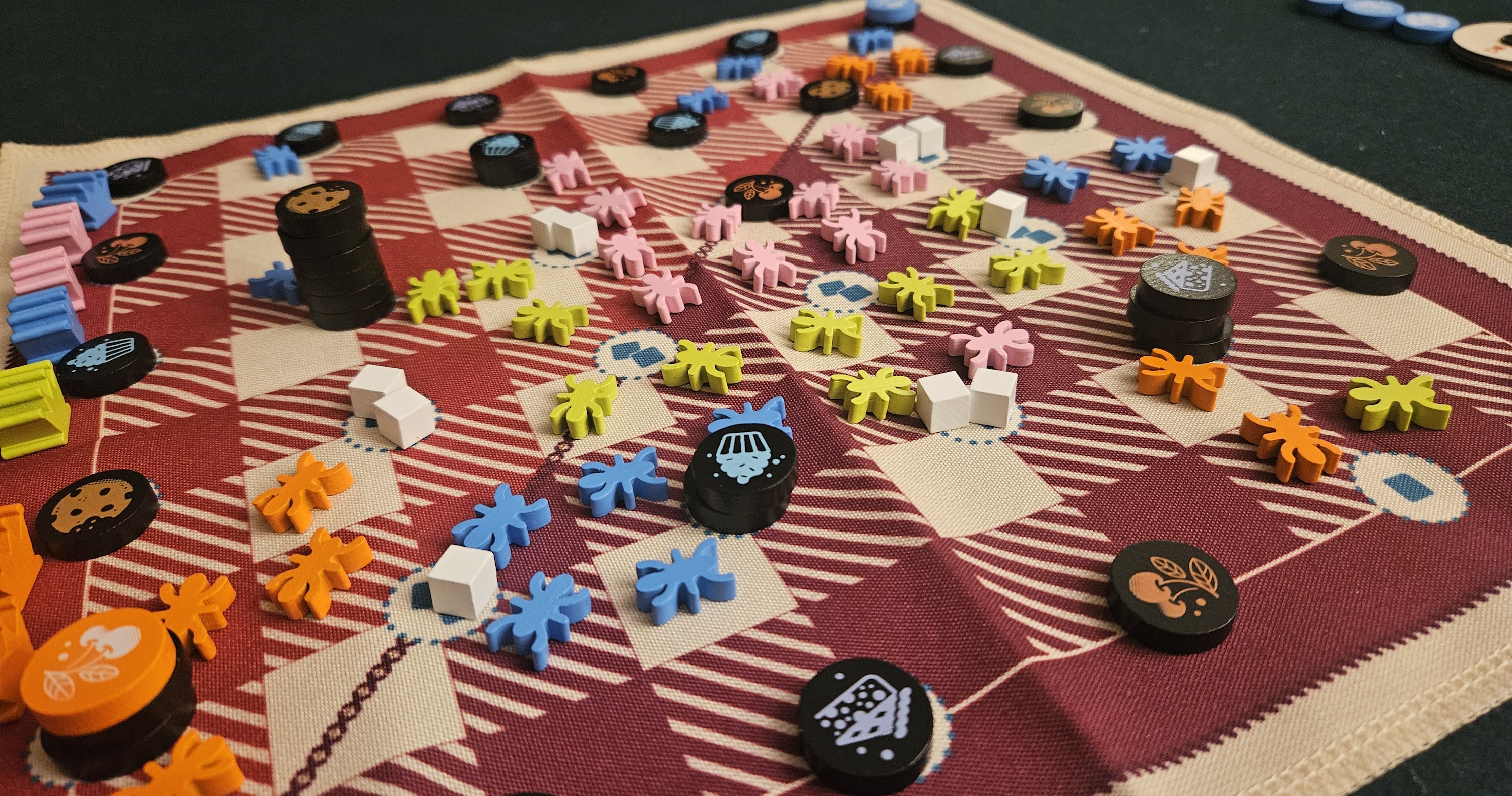 Meanwhile, your placements can be contested by rival ants. Bumping an ant is never an easy decision, since the bumped ant then gets placed on any empty space by its owner. But that space must be empty — there’s no chaining bumps here — and it’s often worthwhile to disrupt a chain of ants. That goes double once ants begin clustering around one of those heaped-up piles of food. The second way to score is by surrounding such a pile, which allows you to place a token over the top of it, earning points both now and at the end of the game. Provided it hasn’t been stolen away, that is. Piles on the corner or edges of the blanket are easier to claim, but also easier to steal. Another tension to consider.