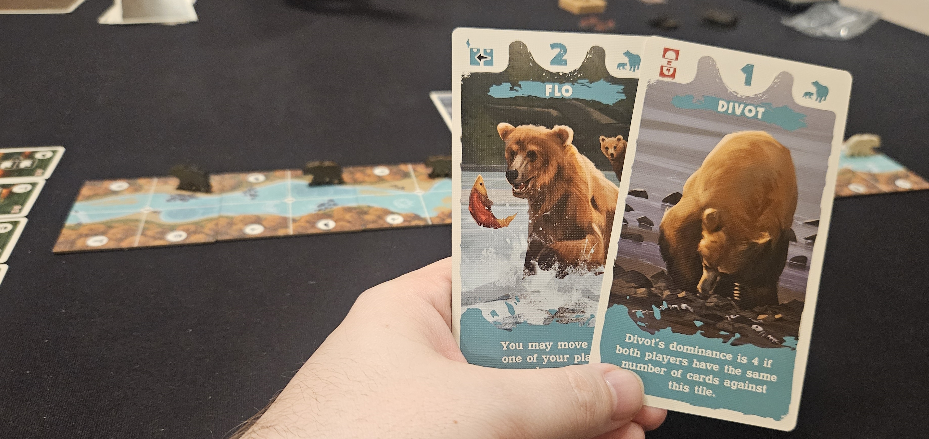 Unsurprisingly, the best thing about Katmai is the bears themselves. These are actual bears, creatures that bear-watchers observe via livecams during spawning season, and no small part of the game’s warmth comes from Tom Lopez’s illustrations and Ridgeway’s card abilities. Before long you’ll get to know the big boys, hulks like 747, Norman, and Chunk, who can’t help but make a splash when they appear on the river for their sheer bulk.