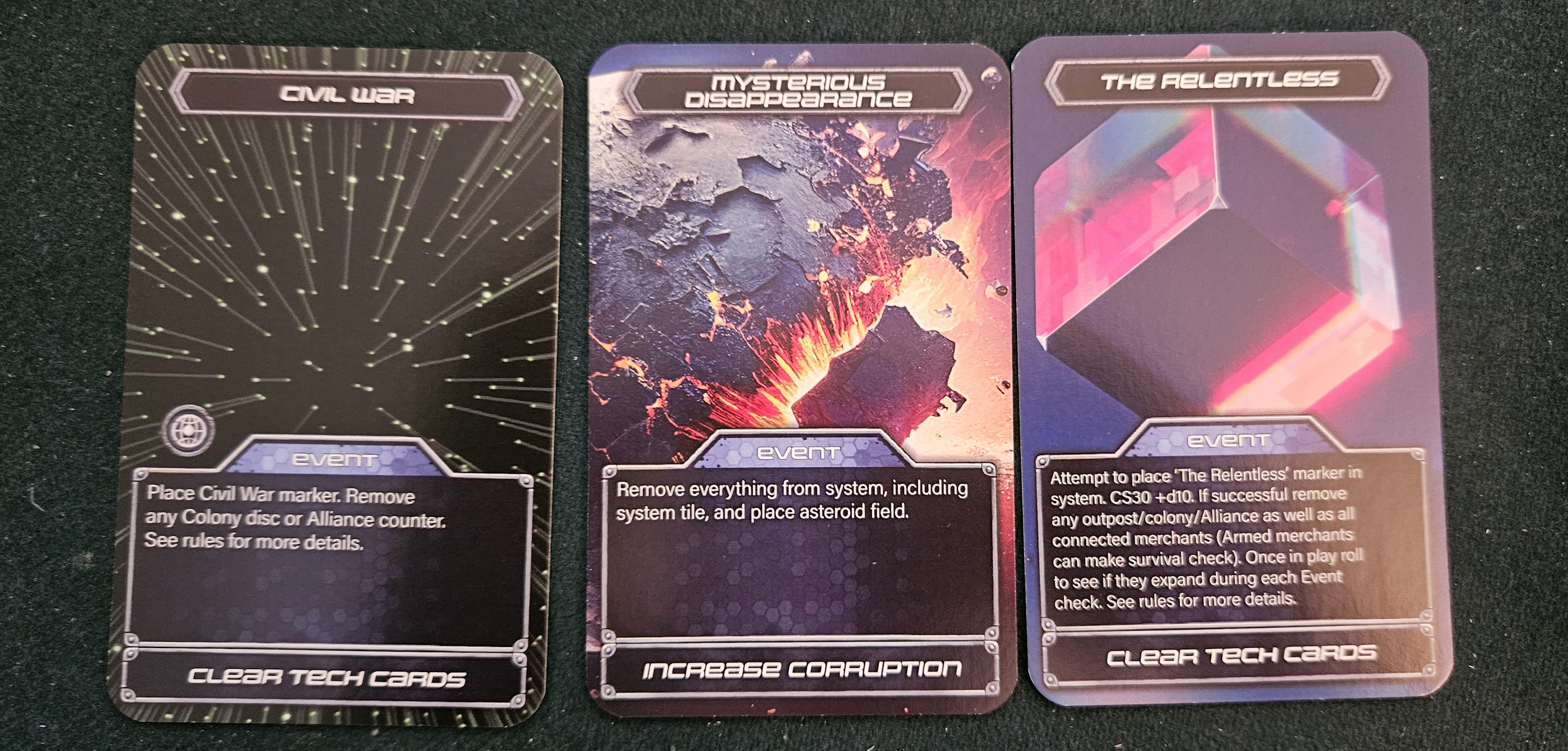 Those traits, however, are precisely the point. When a civil war breaks out on your most important planet, that stinks. When a nine-dimensional entity exits non-space, consumes a colony, and threatens to expand to its neighboring stars, that’s a worrisome development. Once, an entire system, including every single fleet and outpost, disappeared completely from a fellow player’s empire. They had been amassing to fend off a Korolan incursion at the time. Now their entire fleet, cobbled together one card-resource at a time, was gone.