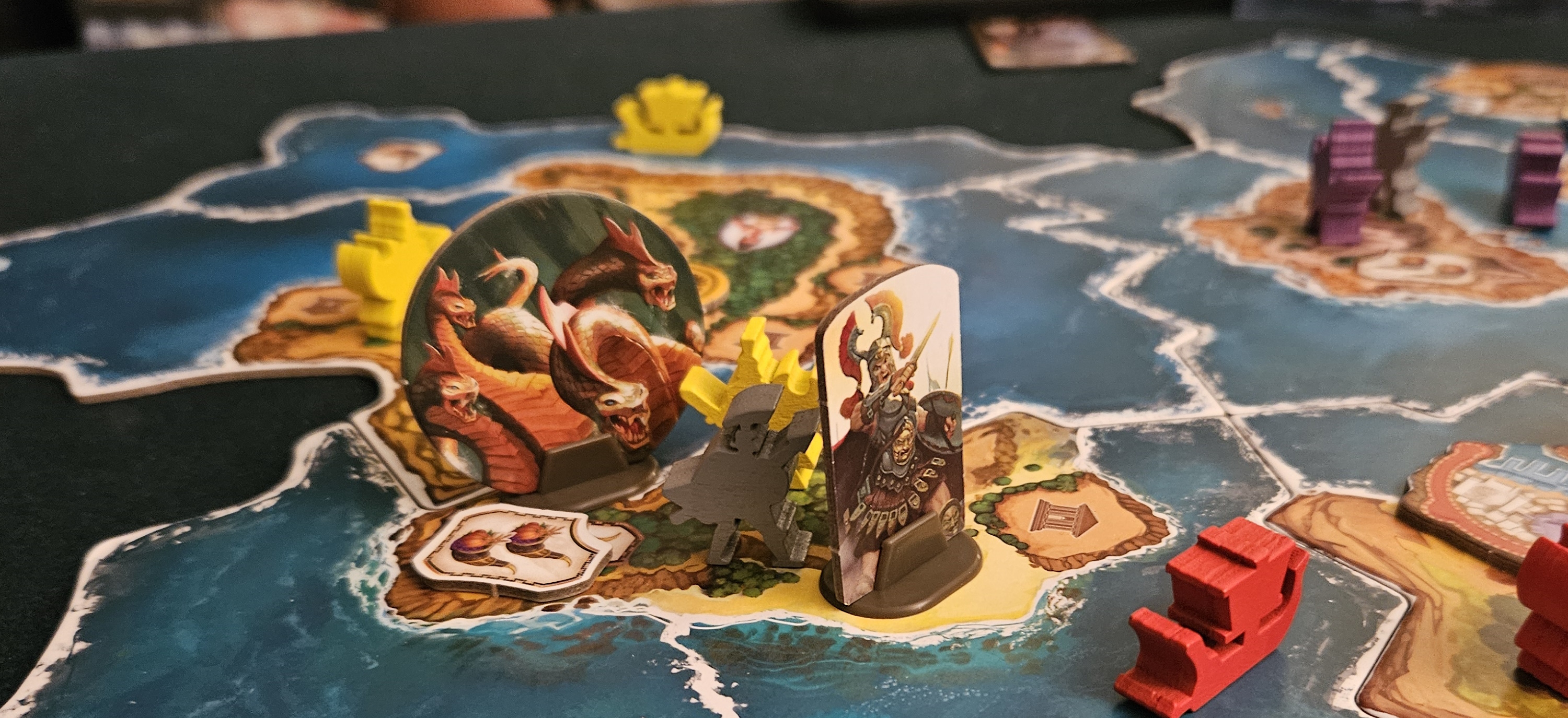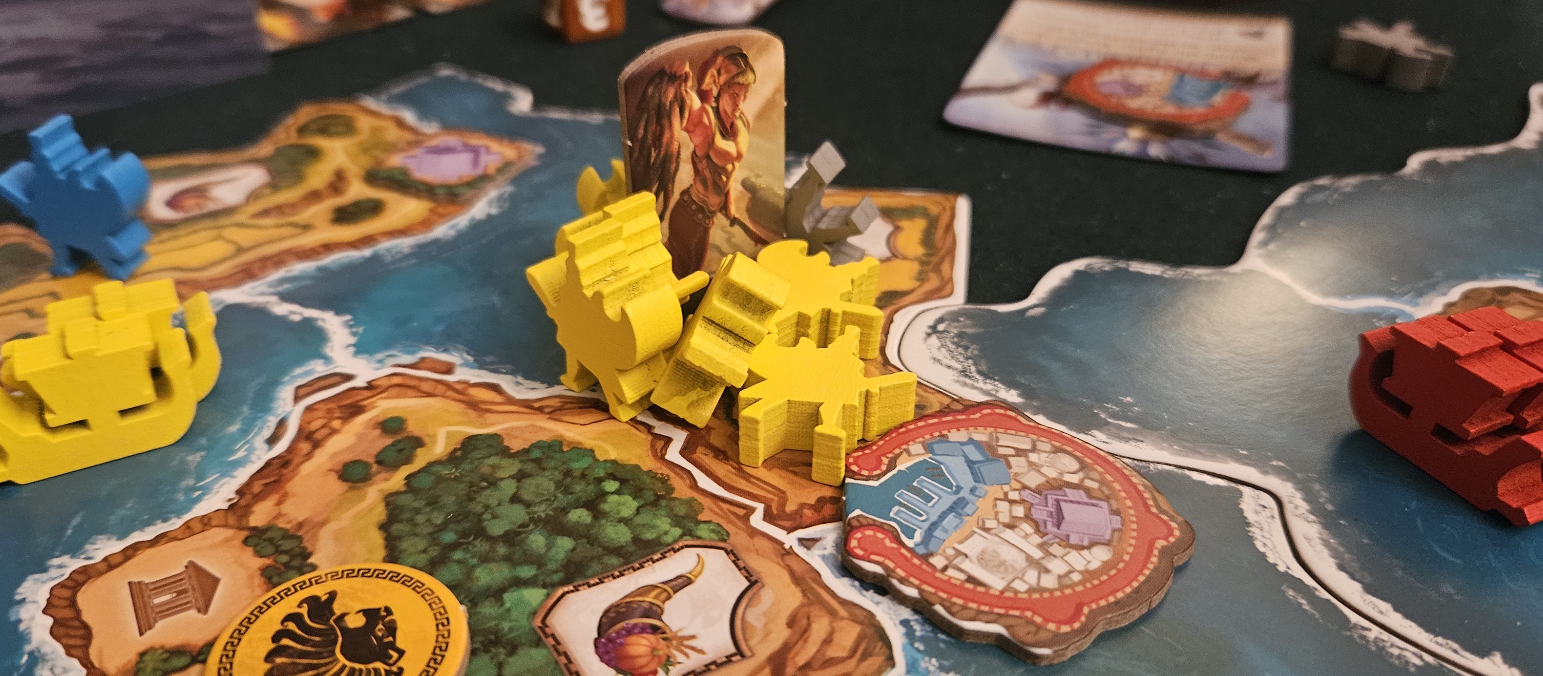 Other changes are similarly textured. Previously Ares was critical, being the only god who raised and moved armies. Now any member of the pantheon can move armies, provided they’ve had Hera recruit a hero at some point. Heroes are an intriguing distinction from the original game. Like monsters, they add abilities to the table, and can even be sacrificed to trigger some ultimate power. Odysseus cheats by building a metropolis from three buildings instead of four! Hector murders anyone who invades his space! Perseus is basically a new Pegasus! But while sacrificing a hero is tempting, they’re most valuable for their ability to move and attack at almost any moment. Cyclades has never been more dangerous.