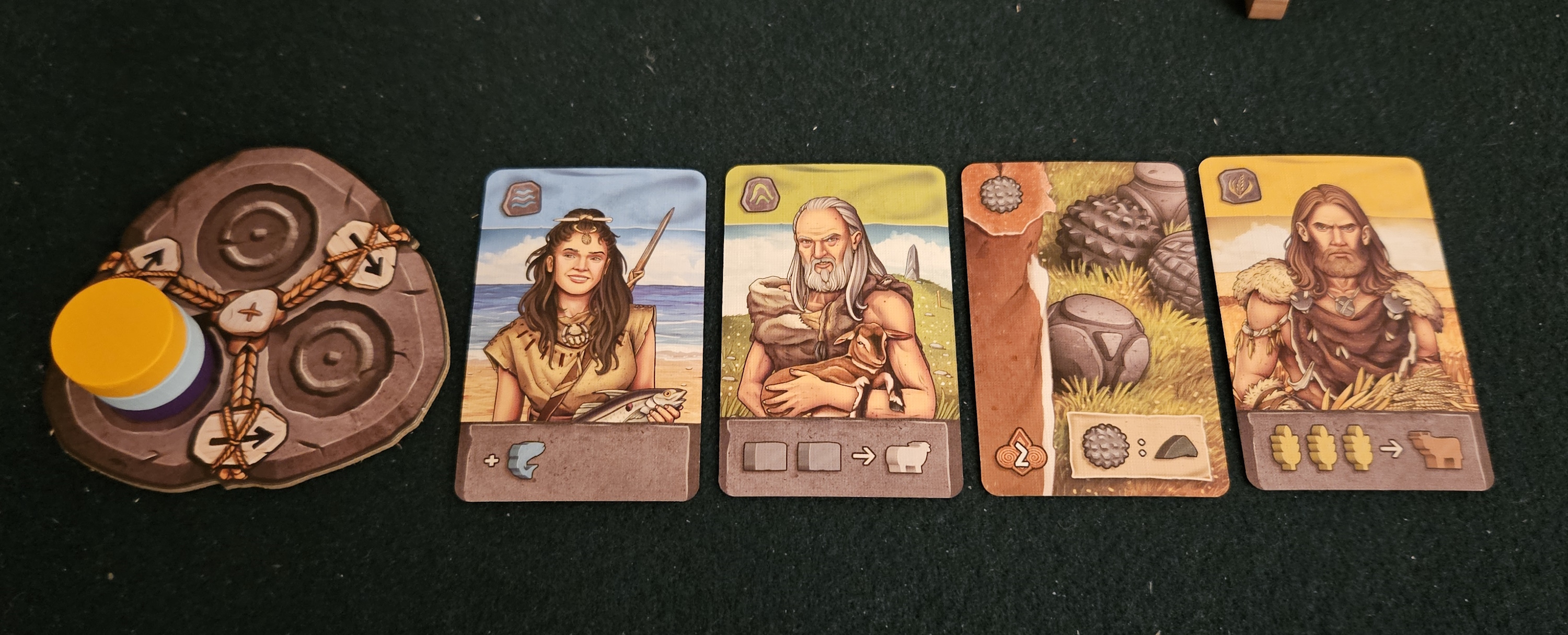The first portion is the simplest of the bunch, three drafts spread across each round. Players are presented with a handful of options, mostly villagers they can invite to their settlement, but also the occasional set of stone balls, sheltering rooftops, or food-preparing utensils. Everybody picks one for themselves, then moves onto the main attraction for the round.