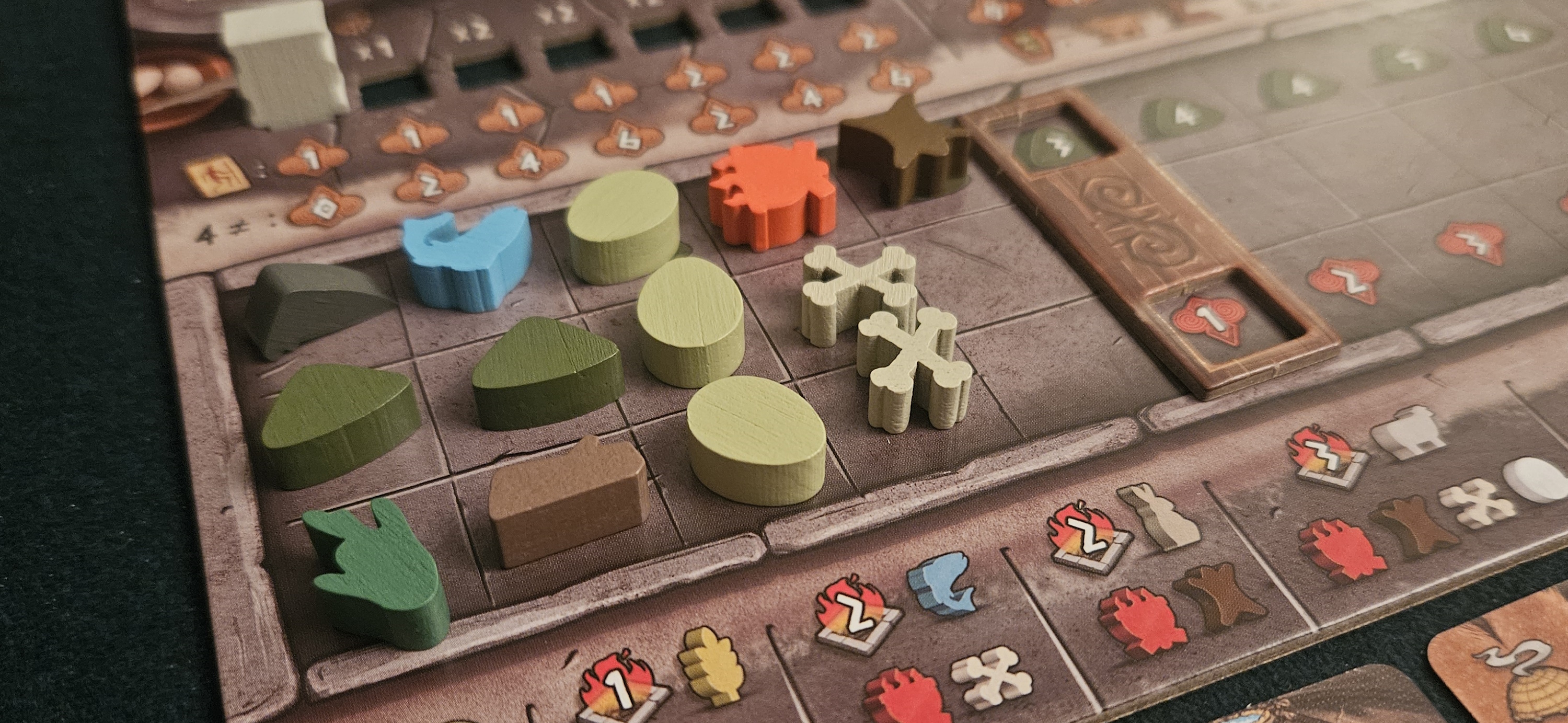 Unlike some games about resource conversion, where seasoned players might run a series of swaps in their head before actually grabbing anything from the supply, Skara Brae asks its players to physically claim each token. That’s because your inventory is severely… not limited, that isn’t the right way of conceptualizing it, but prone to overflowing. As resources are gathered, they’re placed in your storage bin. I know, I know, that goes without saying. Your bin, however, has a cap that slides upward whenever you breach its limit. Your actual storage space can accommodate quite a few shells, bones, and foodstuffs, but pushing this container’s lid ever upward presents its own problems.