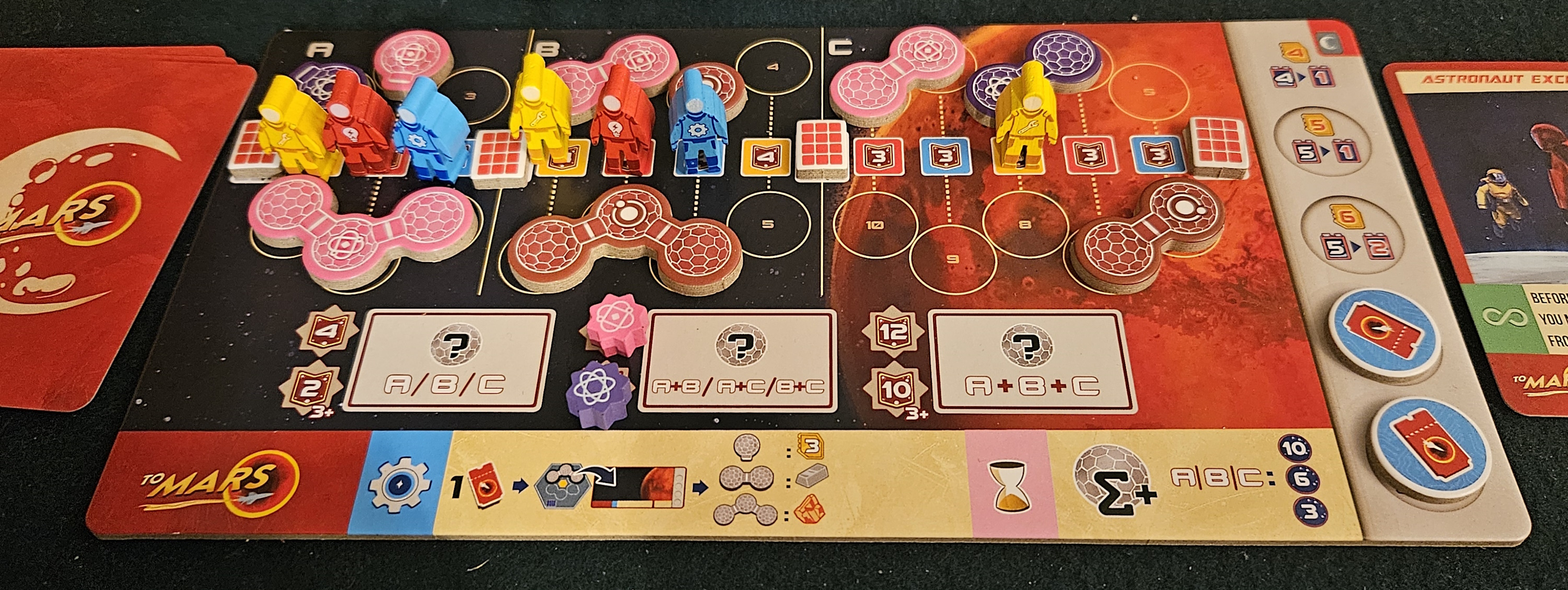 But then there’s the third action. Lest you be caught unawares, it is not, in fact, one action. Rather, it’s a trifurcated menu of three sub-actions, each of which may gain some minor bonus if you deploy the right astronaut, but doesn’t kick up a fuss if, say, you send a scientist to oversee the construction of a boring old dome or whatever. Basically, these options come down to “build stuff,” “buy a card,” or “finagle with the corporations.” Plus some extra steps and sideways combo bonuses to placate the Euro Gods.