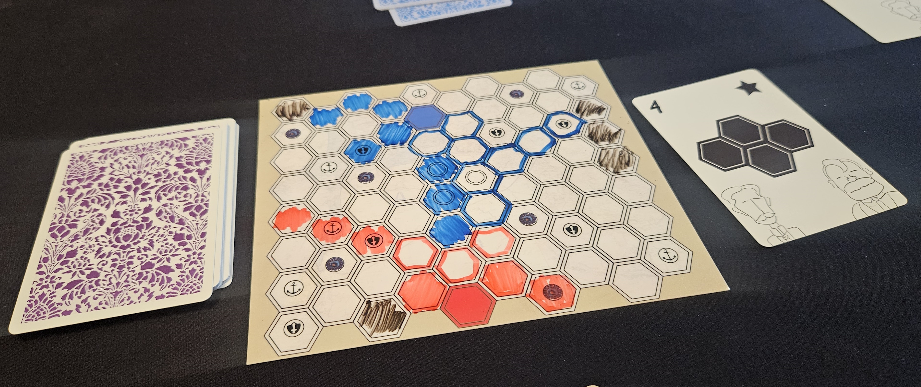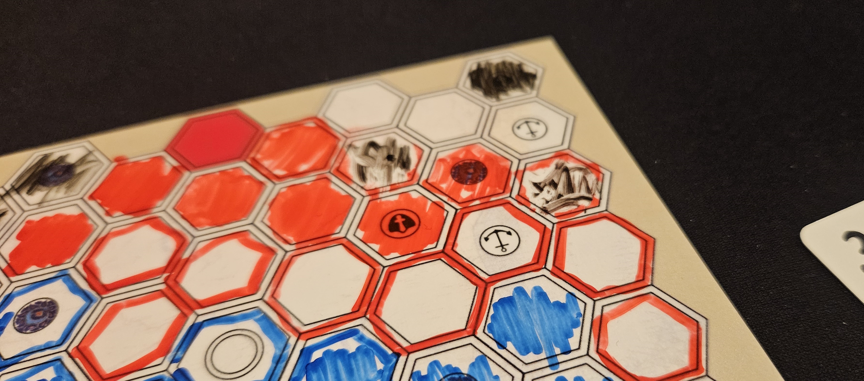 As noted earlier, there are three colors that can be penned onto the map, red for the U.K., blue for France, and black for international control. Each trick follows the same format. The winner takes either of the cards played into the trick and marks its boundaries onto the map. This isn’t as simple as a binary France-or-U.K. division. Instead, both sides can either mark influence (an outlined hex) or outright control (a filled-in hex). Crucially, to stave off any future conflict between superpowers, these sides’ controlled territories may never border one another. Influence? Sure. But outright control is a no-no.