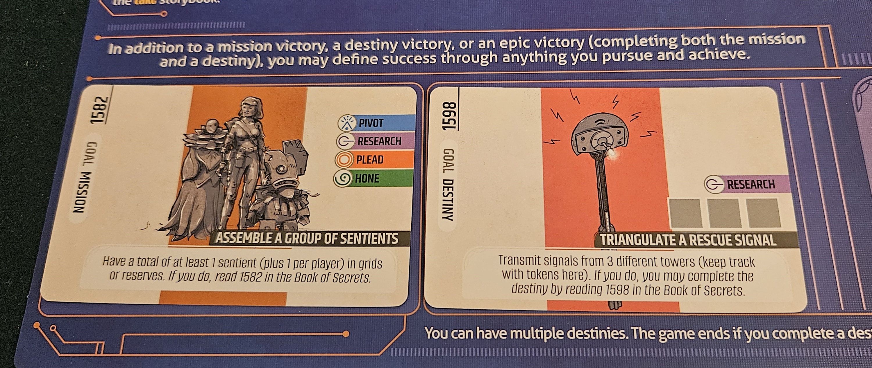 When you settle on a course of action, somebody flips to the corresponding storybook. There are six in total — no, eight — one for movement and another for helping and all the rest of the possible archetypes, plus a couple more for actions that are harder to discover. Unlike other storybooks, those found in titles like The Elder Scrolls: Betrayal of the Second Era or Lands of Galzyr, which unfurl their stories in paragraphs, Vantage offers sentences, often as little as one or two, along with a difficulty rating. This is how many dice you’re required to roll, with higher numbers being more dangerous.