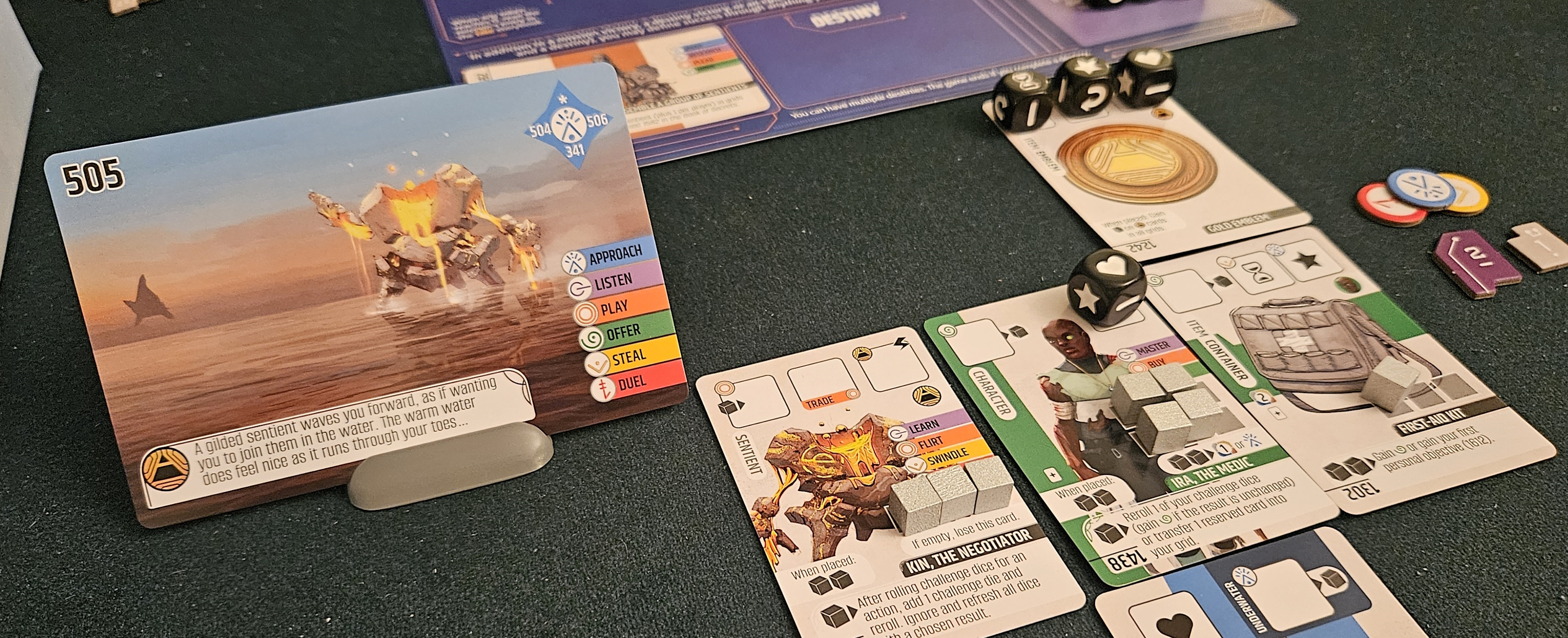 Fortunately, while this illustrates where some of Vantage’s seams show through the stitching, it was an exception rather than the rule. But it does speak to the proper mindset for experiencing this thing on the table. Vantage is all about the ride, man. It’s about going on a journey and not worrying too much about where you wind up. This is the foremost reason why I balk at comparisons to Scavengers Reign. Here, even survival is often a secondhand concern. Sure, there are lengths you’ll go to in order to keep your health trackers from dipping too low. But even failure, when you flip to the corresponding page, outright asks if you want to end your session or accept a bunch of extra health and keep playing. On the chill scale, that’s pretty darn chill. Vantage is for vibin’.